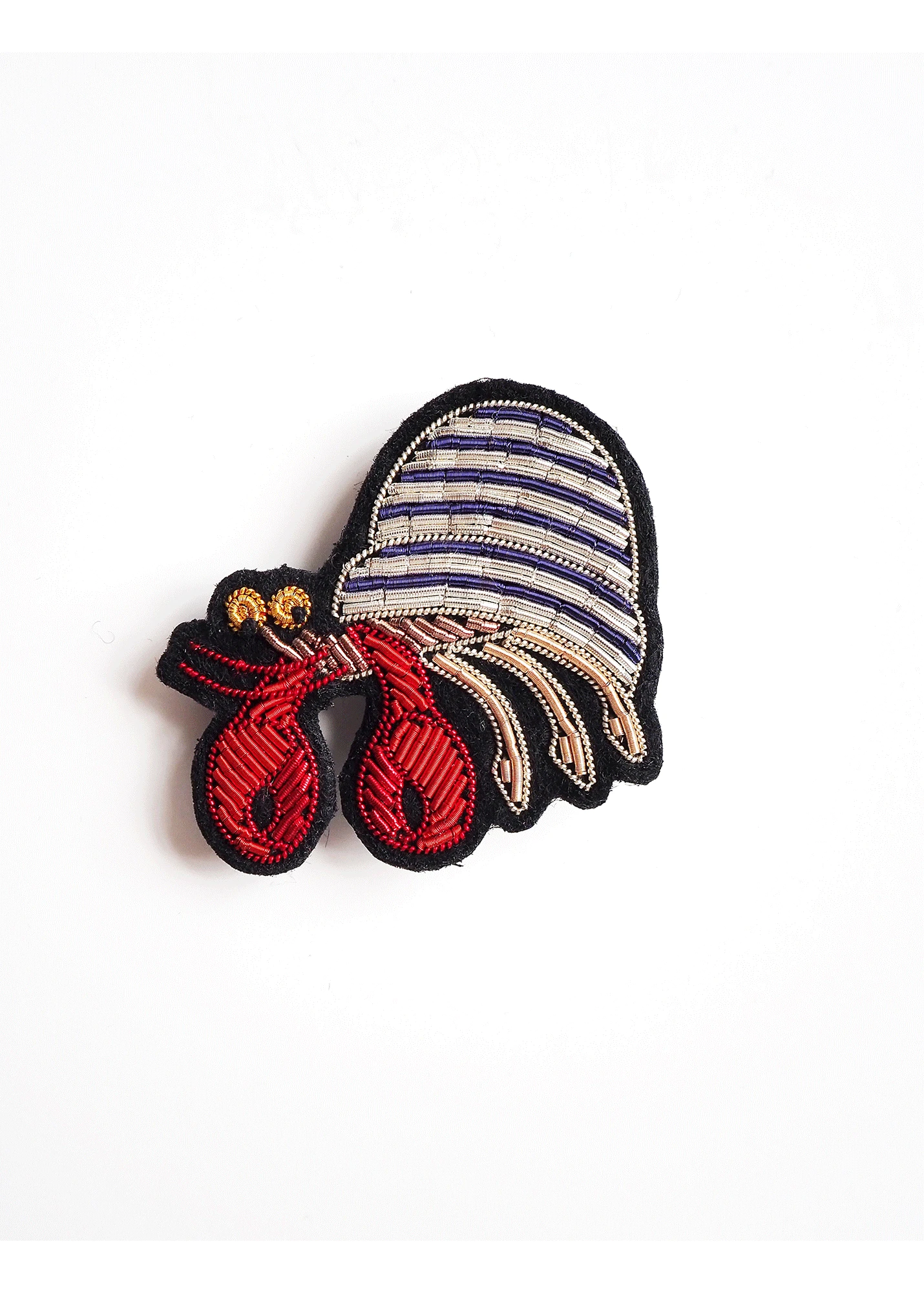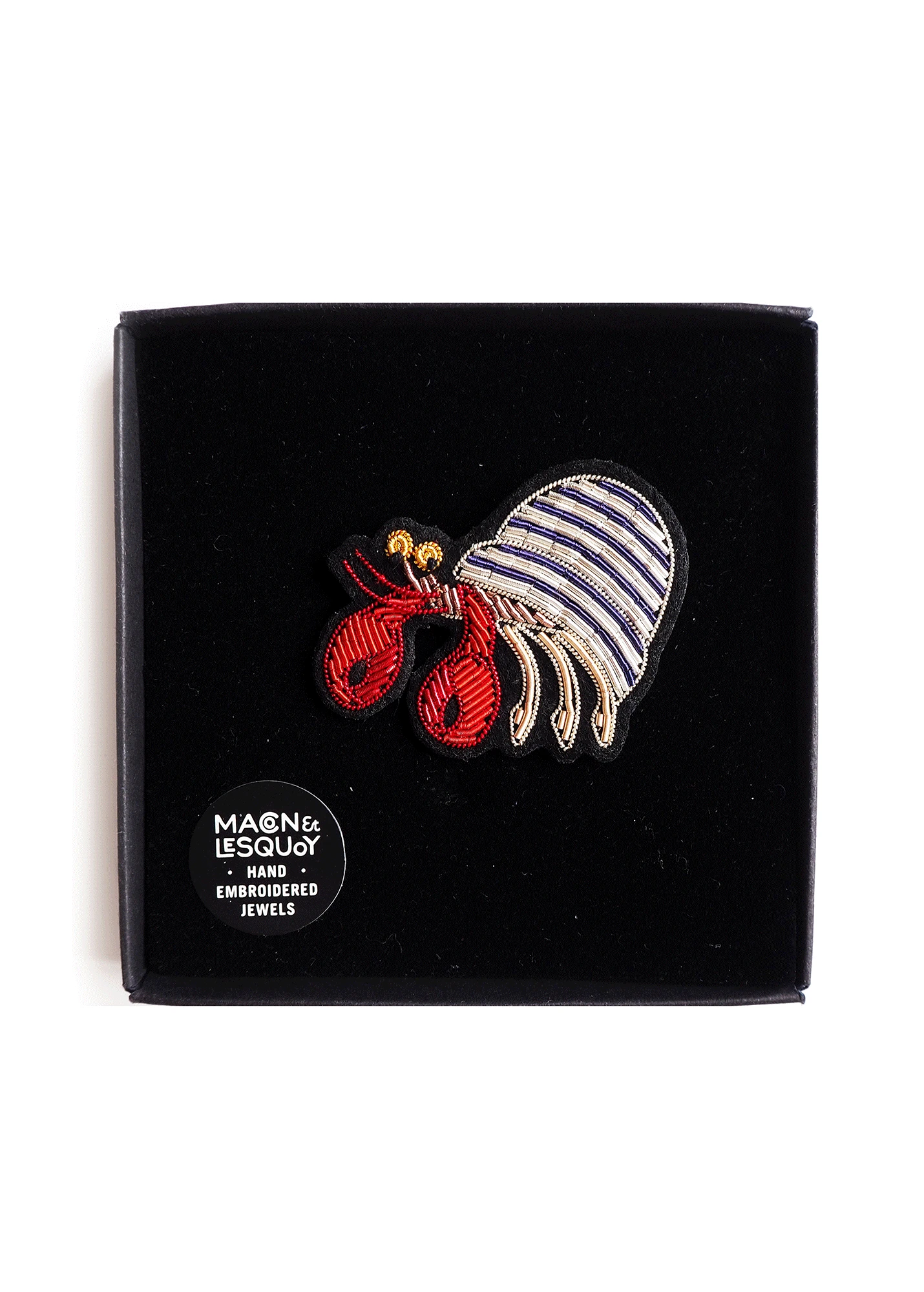 Ce Bernard l’Hermite a trouvé une jolie coquille : un bonnet rayé SAINT JAMES ! Brodée à la main, cette broche a été dessinée par Macon & Lesquoy en exclusivité pour SAINT JAMES.
