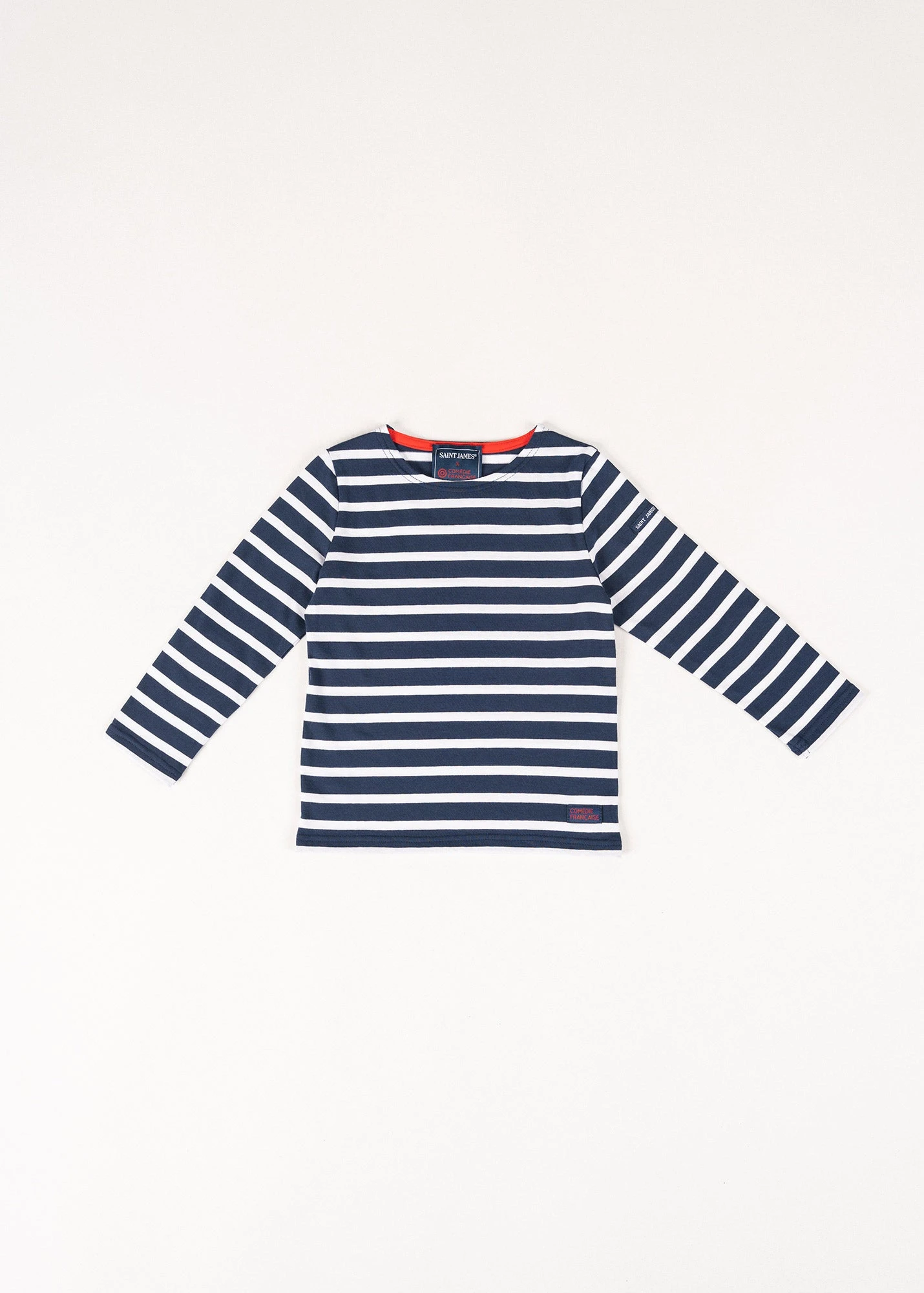 Les enfants aussi ont droit à leur marinière Comédie Française. Inspirée de notre iconique Minquiers Enfant, cette marinière en coton léger est un incontournable de SAINT JAMES. Aux coudes, des coudières reprenant le logo de la Comédie Française portent le symbole de la collaboration entre nos deux maisons.