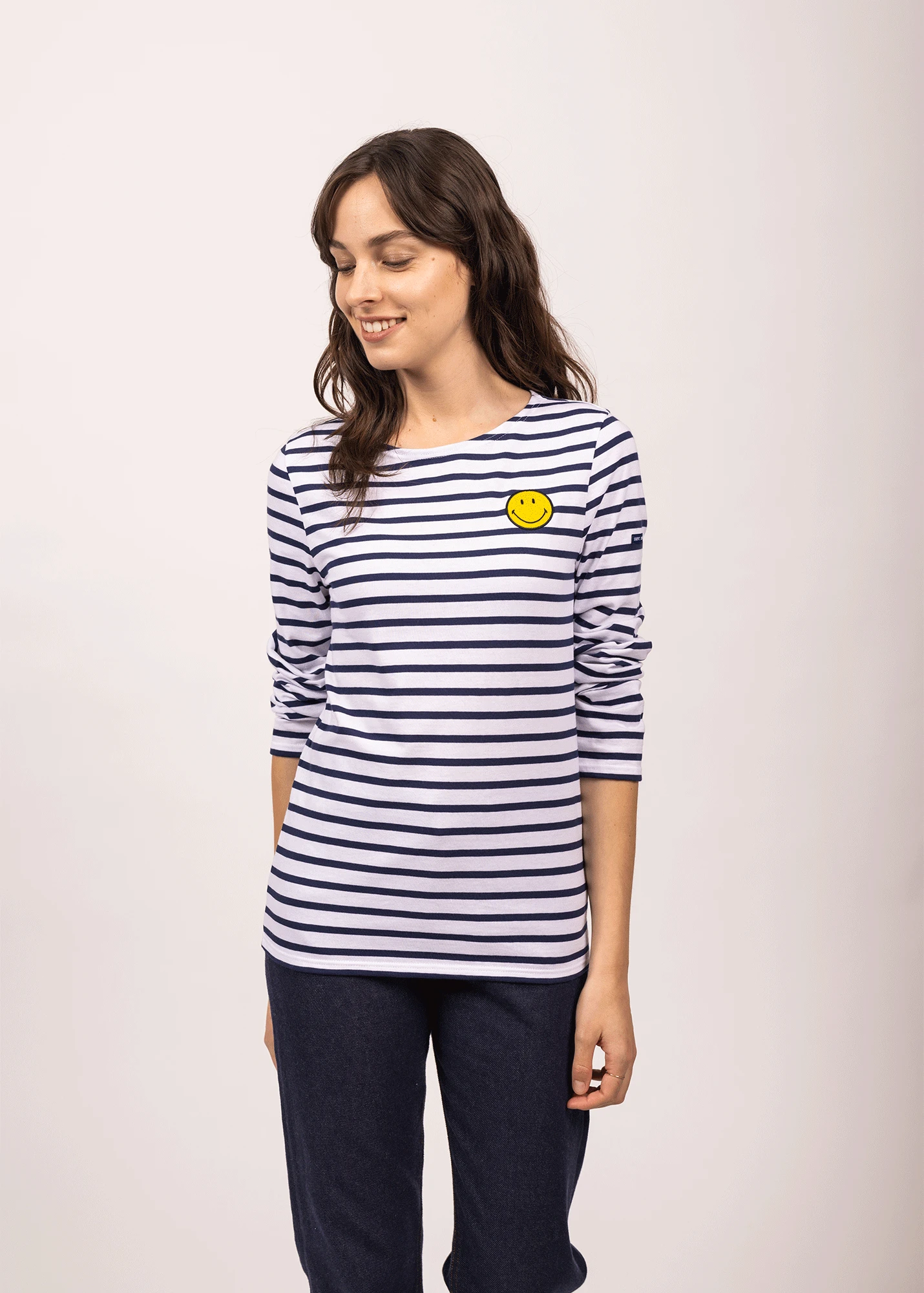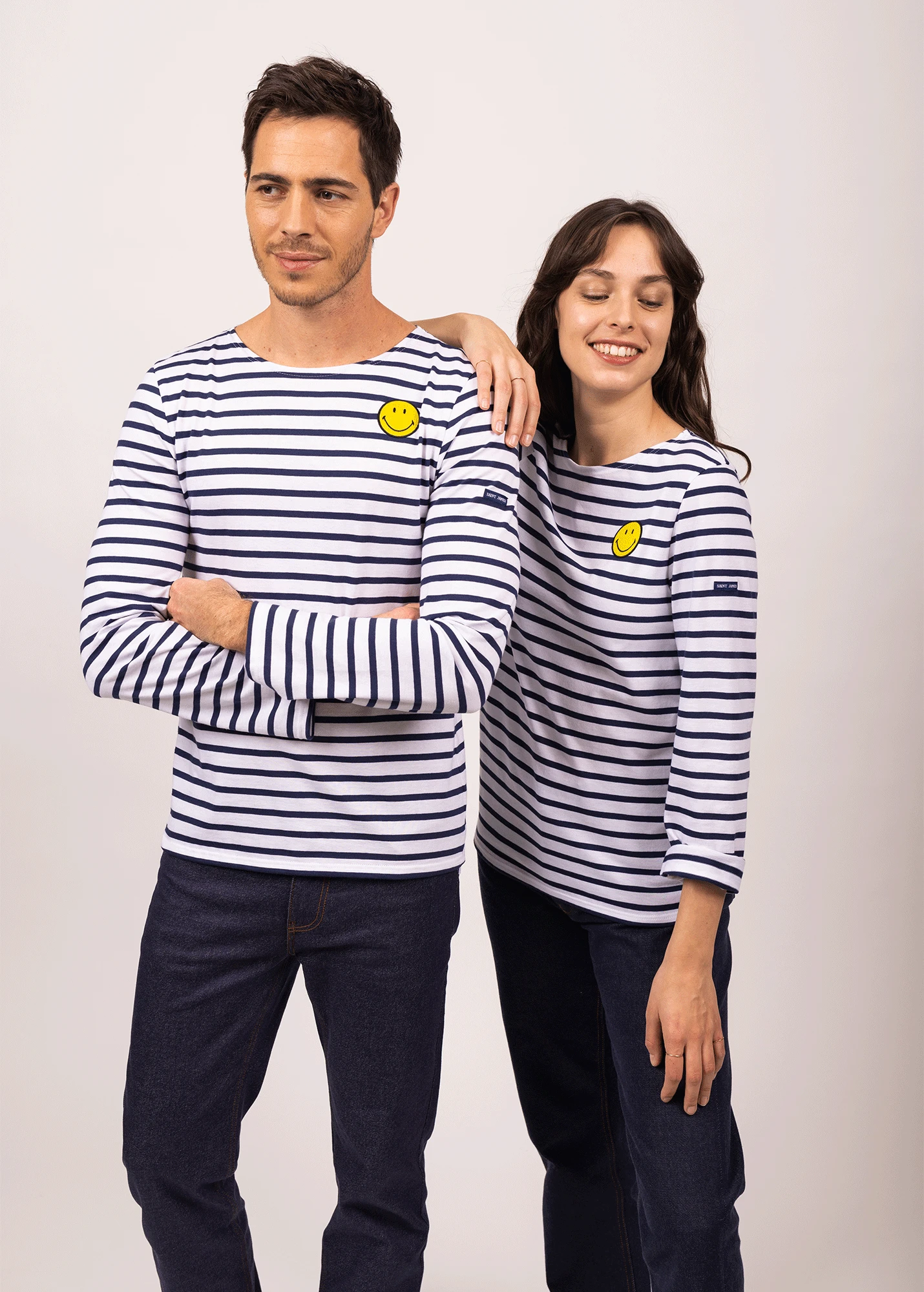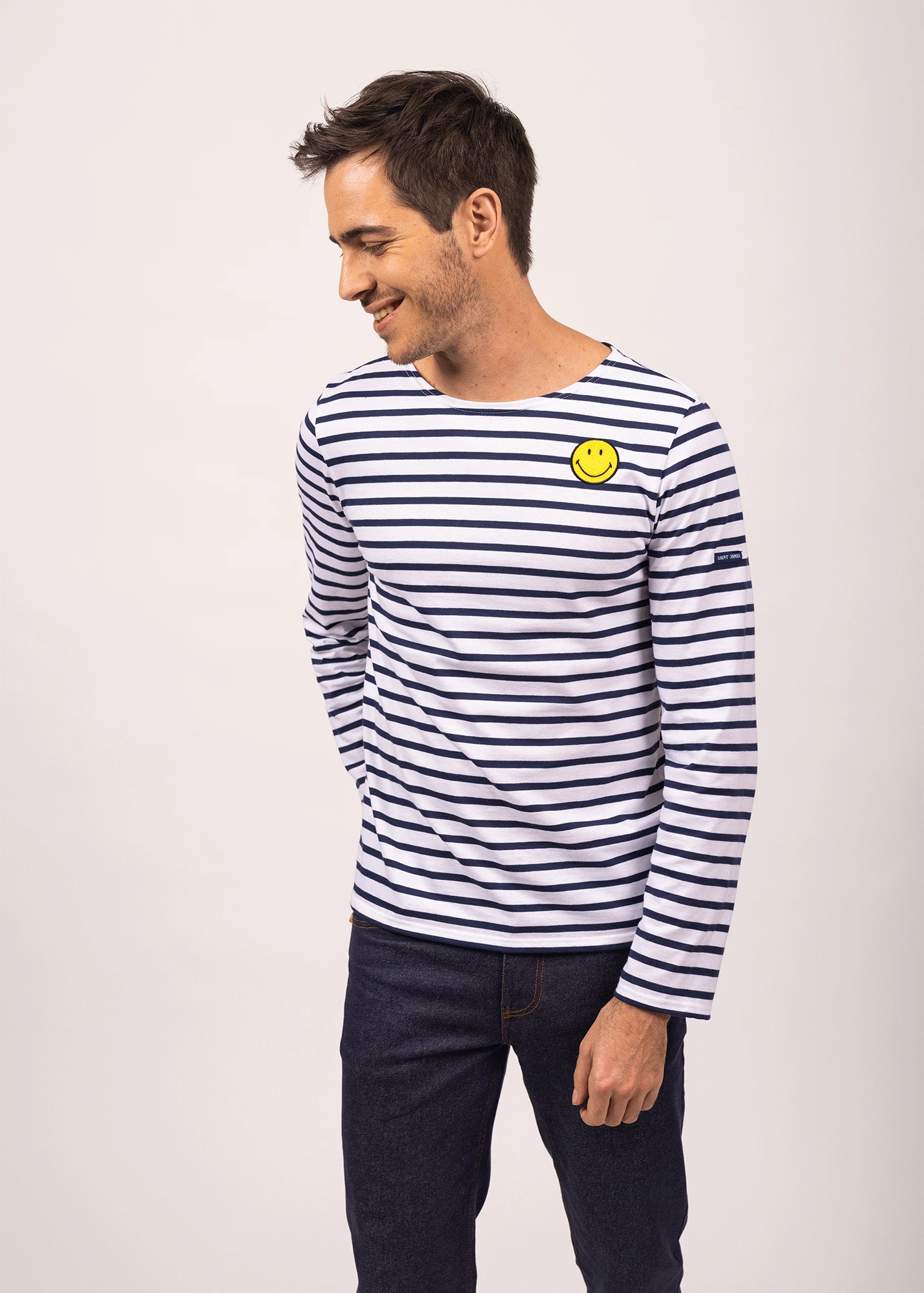 Pour célébrer le 50ème anniversaire de la marque au sourire, SAINT JAMES s’associe avec Smiley pour vous proposer une nouvelle version de notre iconique marinière Minquiers, placée sous le signe de la bonne humeur. Avec son patch brodé Smiley, la classique marinière rayée apportera du sourire et de la joie dans votre garde-robe.