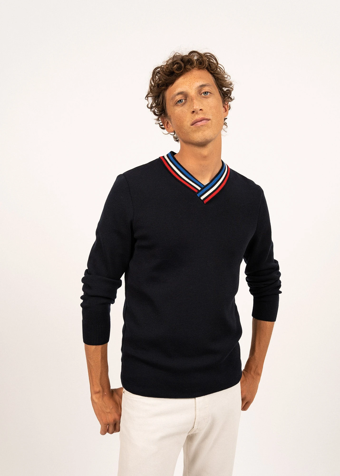 Imaginé dans le cadre de notre collaboration avec la boutique officielle de l’Elysée, ce pull est un pull en laine, col V, tricoté dans nos Ateliers normands. Au col, une bande contrastée tricolore rappelle les couleurs de la République Française.