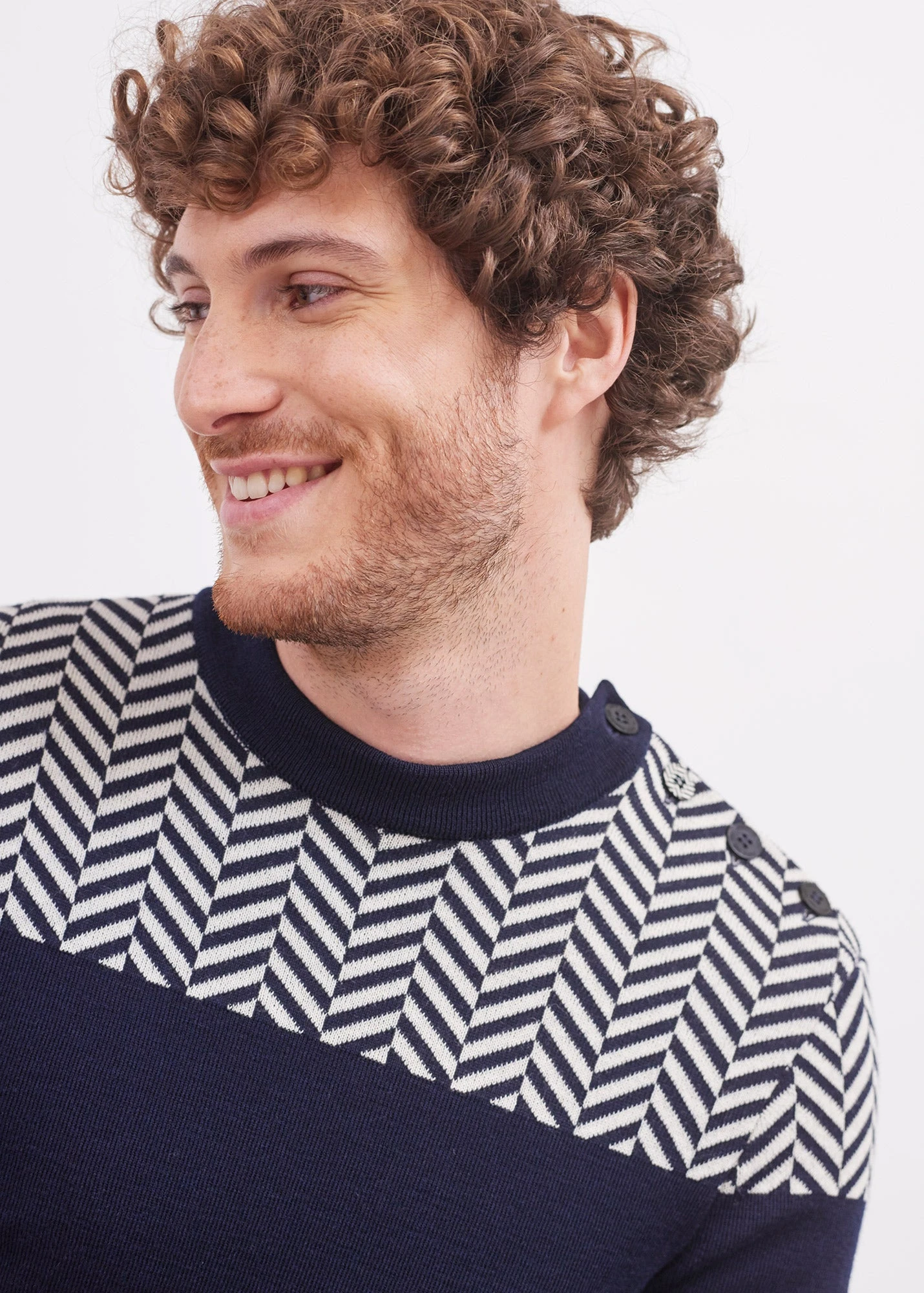 Tricoté dans nos ateliers, le modèle Polaris en collaboration avec Le Slip Français reprend les codes du pull marin SAINT JAMES tout en les réinventant. Un empiècement jacquard à motif chevron sur le haut du corps dynamise ce classique du vestiaire marin quand la laine vierge et le boutonnage sur une épaule préservent son authenticité.