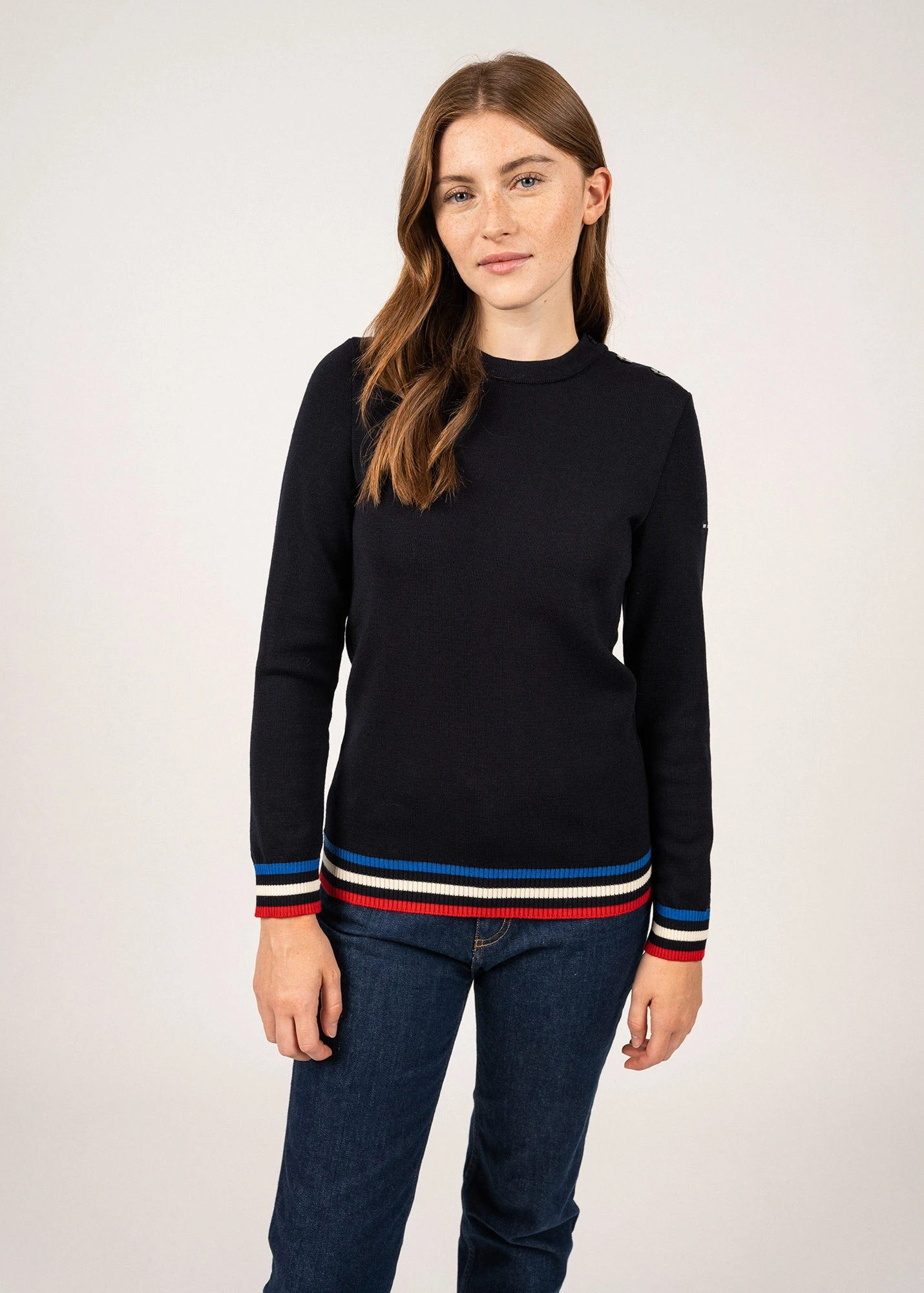 Incontournable du vestiaire marin féminin, notre pull Brégançon se pare cette fois des couleurs de la République française, grâce à son liseré bleu/blanc/rouge. Il reprend les codes du pull marin traditionnel, avec son col rond, son épaule boutonnée et sa laine tricotée en côte 1×1. Un pull idéal pour affronter le froid avec style, tricoté dans nos Ateliers à Saint-James, Normandie.