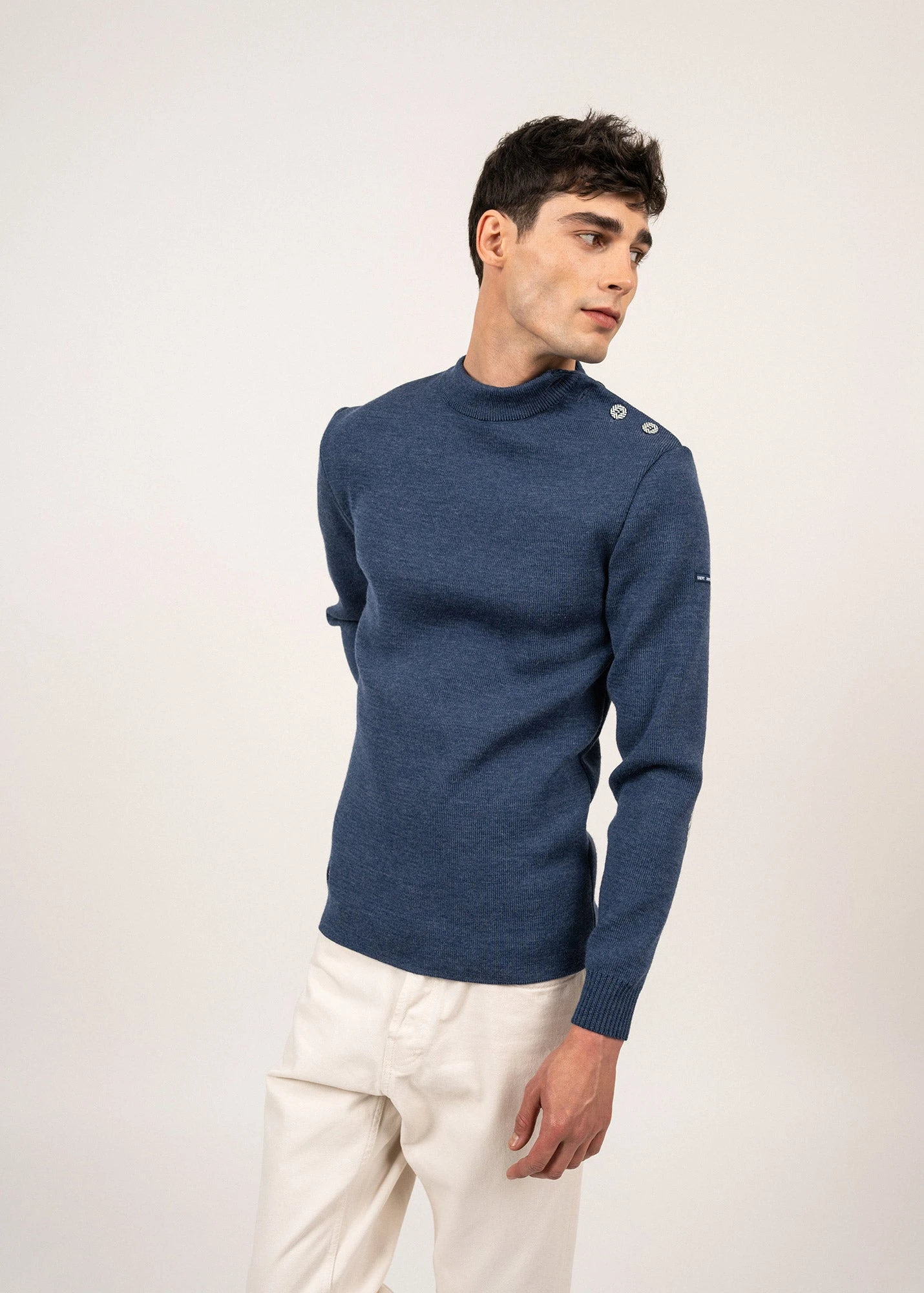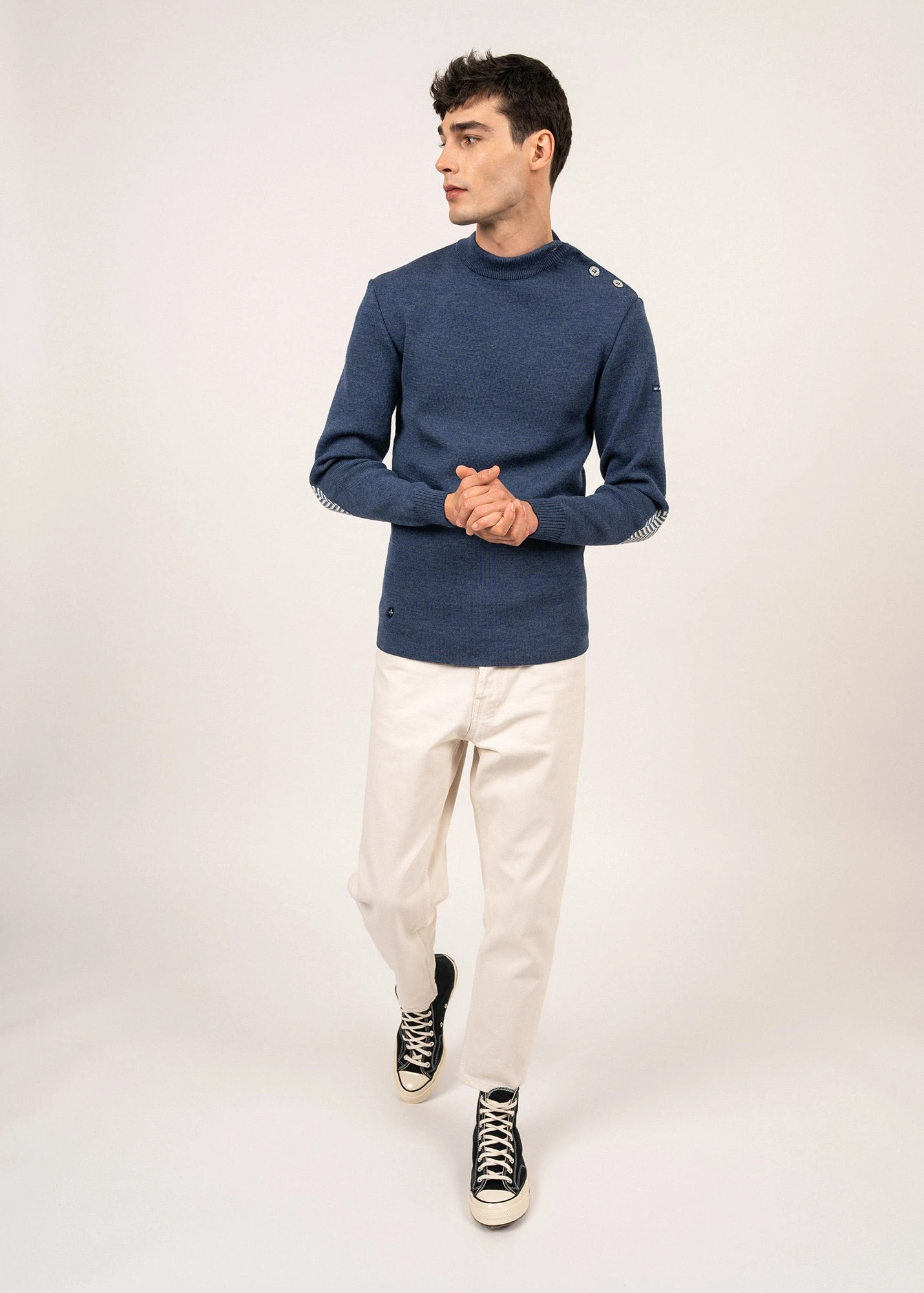 Le pull marin SAINT JAMES, inspiré des chemises de laine et tricoté dans nos ateliers se réinvente à travers la collaboration avec Le Slip Français. Les codes de notre modèle iconique Le Matelot restent ici inchangés, seul un motif chevron noir et blanc, habille graphiquement les coudières et les boutons de cette nouvelle version.