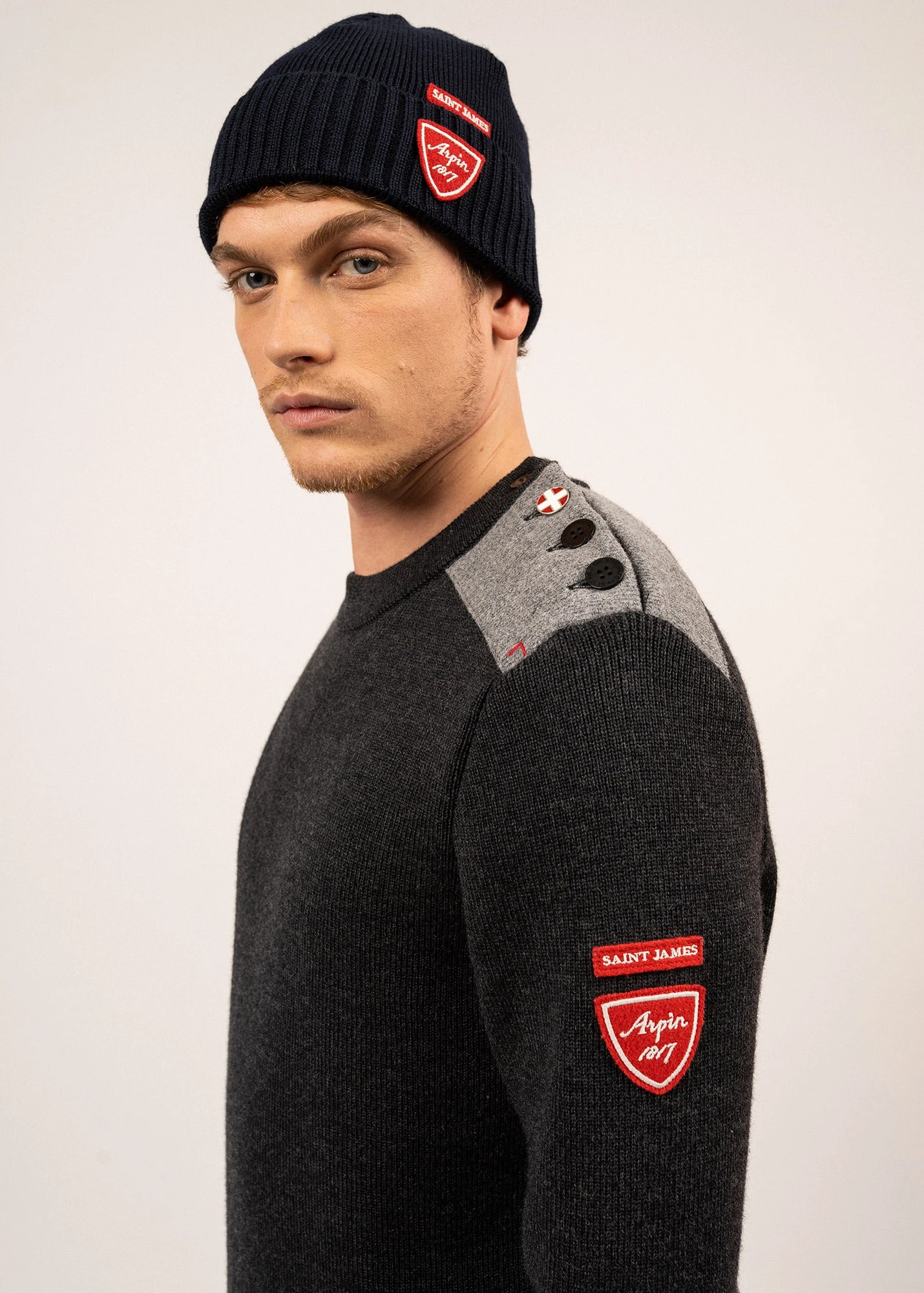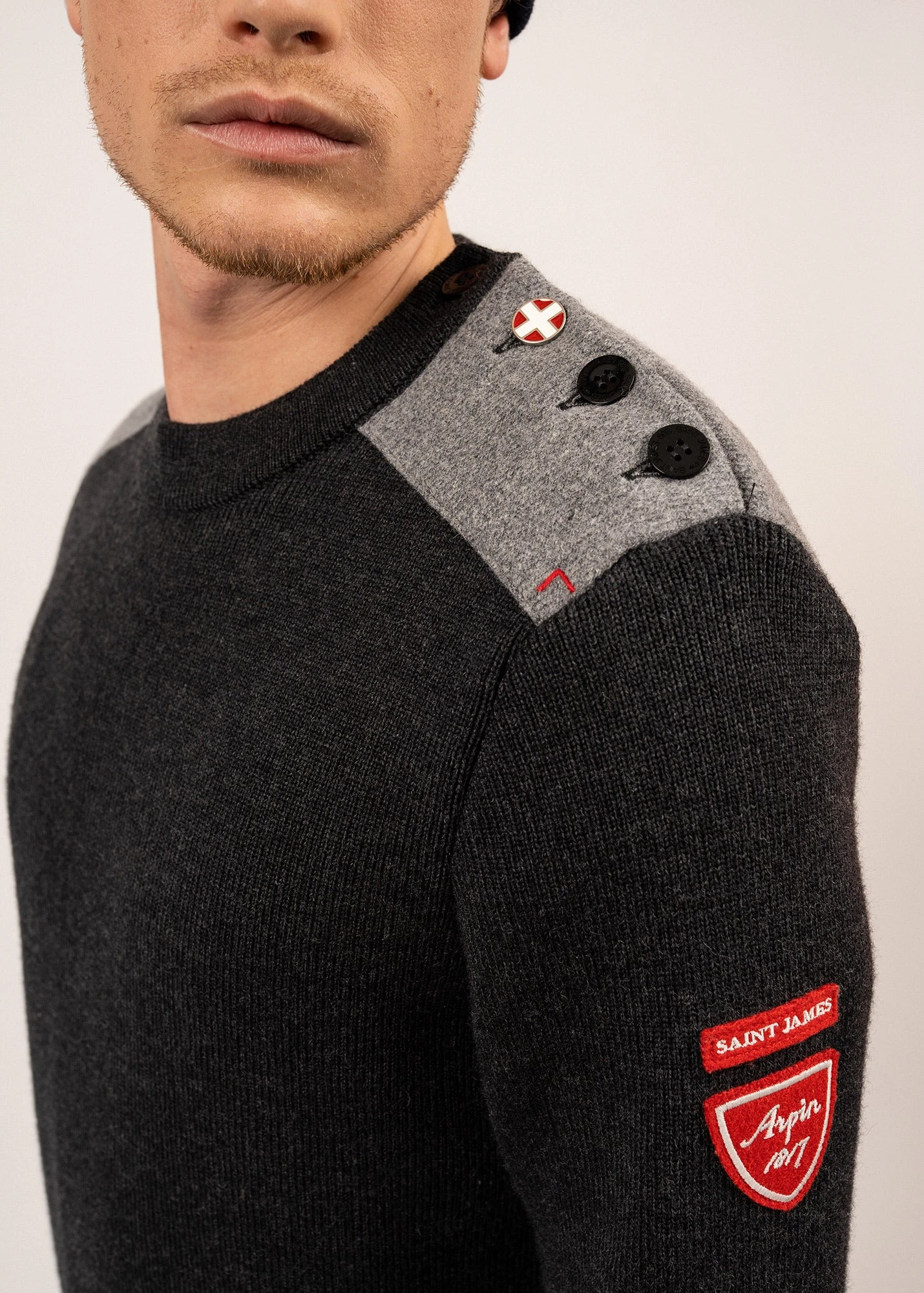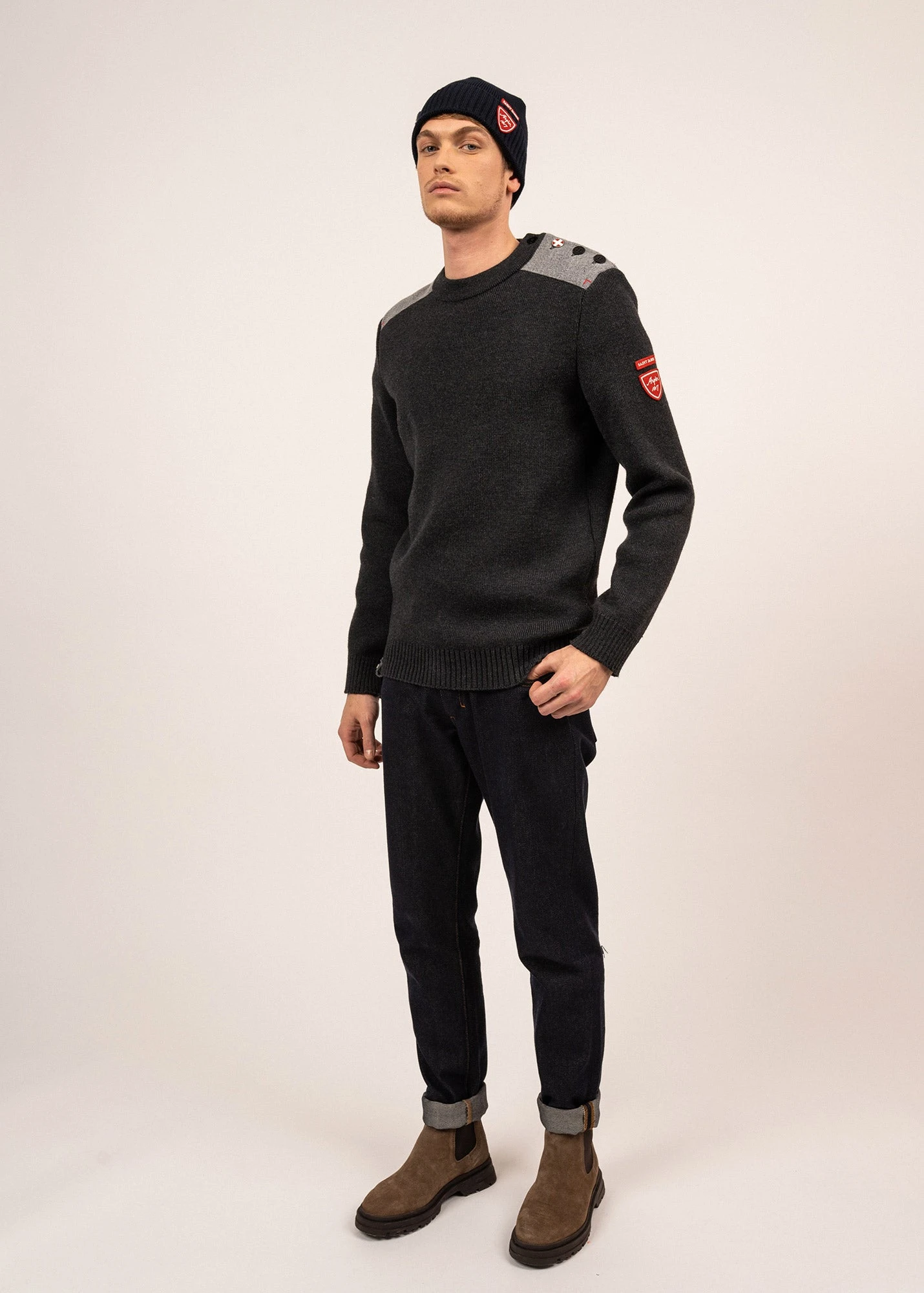 Le Moraine Arpin est un pull en laine inspiré du design de nos pulls marins traditionnels. On aime le relief apporté par ses coudières et empiècements épaule en toile de laine Arpin, ainsi que son col rond remaillé et son boutonnage épaule.