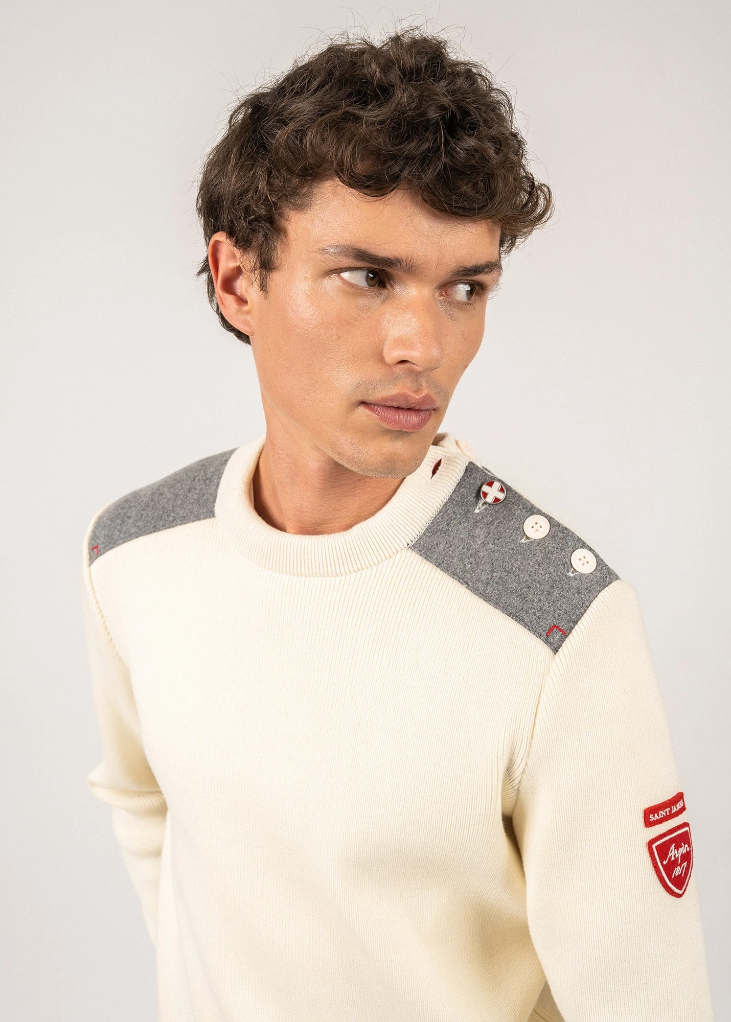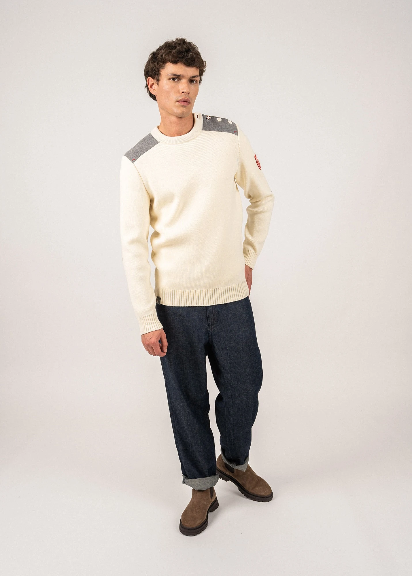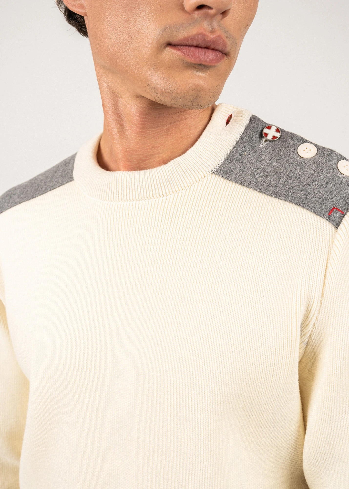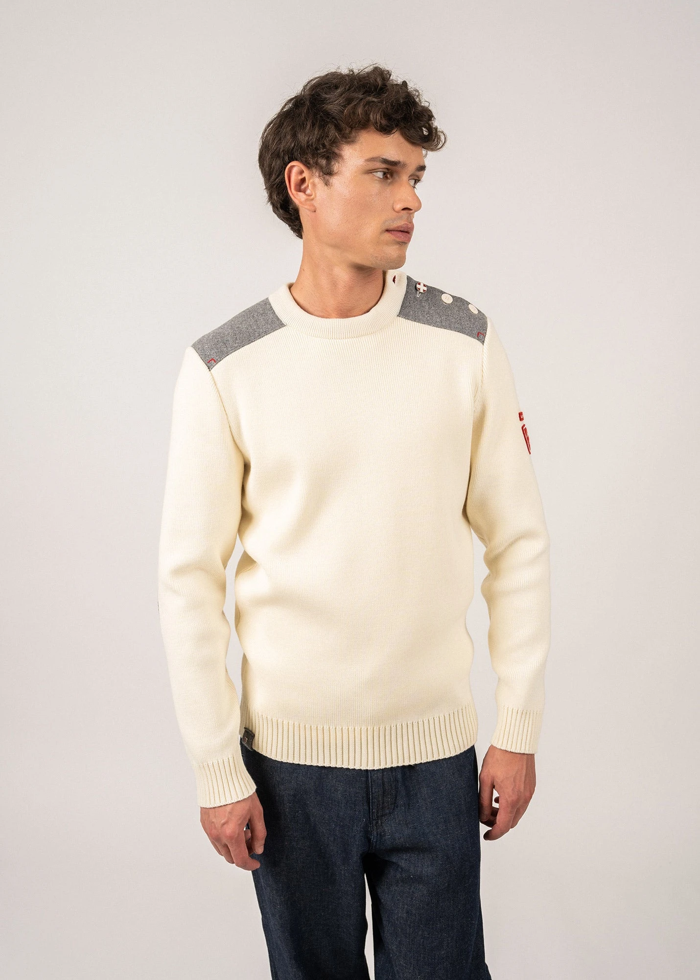 Le Moraine Arpin est un pull en laine inspiré du design de nos pulls marins traditionnels. On aime le relief apporté par ses coudiÚres et empiÚcements épaule en toile de laine Arpin, ainsi que son col rond remaillé et son boutonnage épaule.