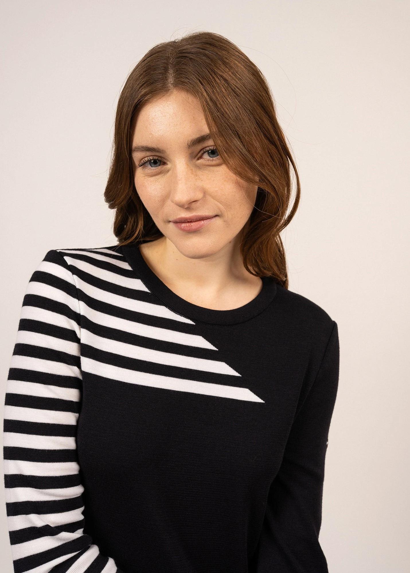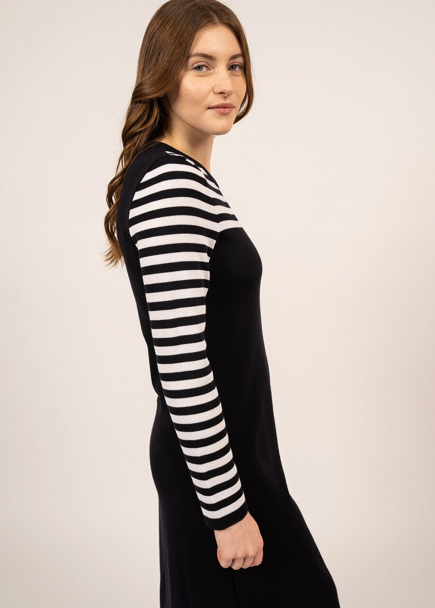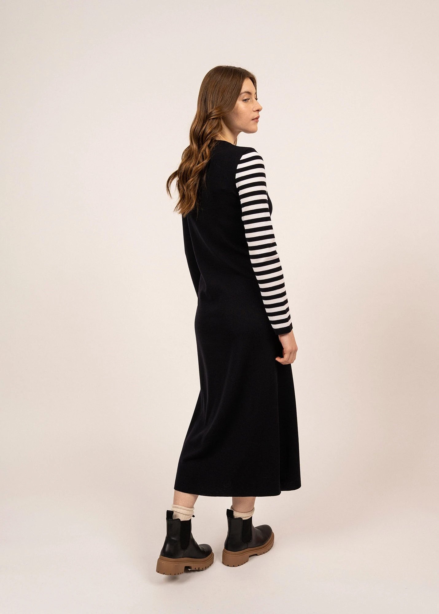 Inspirée par nos intemporelles rayures marinières, la robe Esther est une robe en laine, à empiècement rayé en haut de corps et sur la manches. Longue, en laine, elle est idéale pour celles désirant rester féminines lorsque les températures chutent.