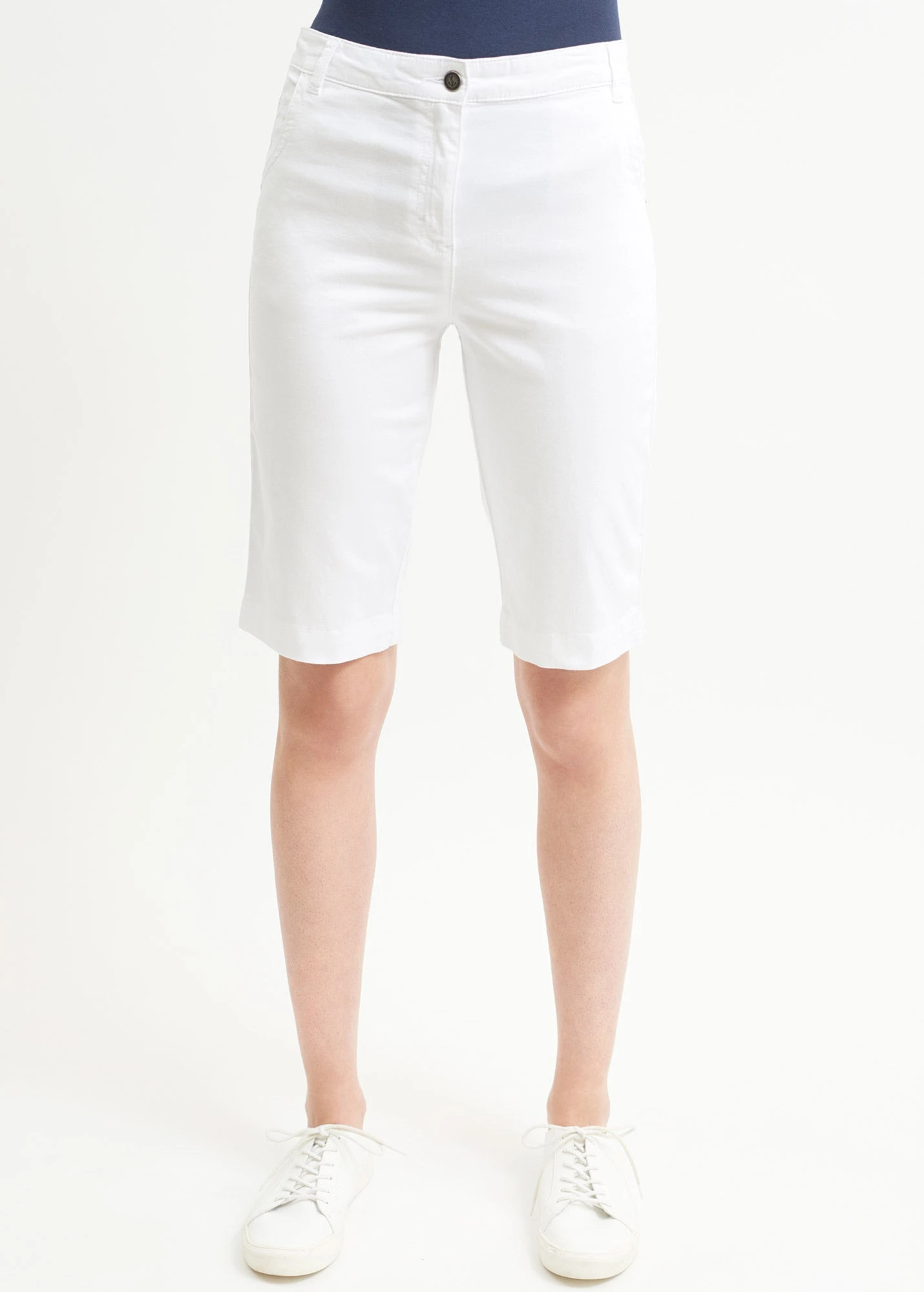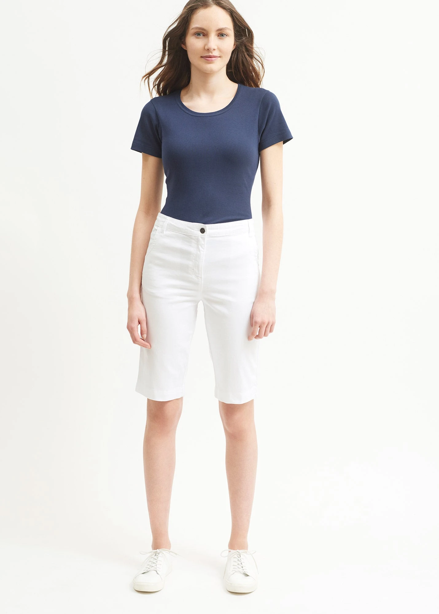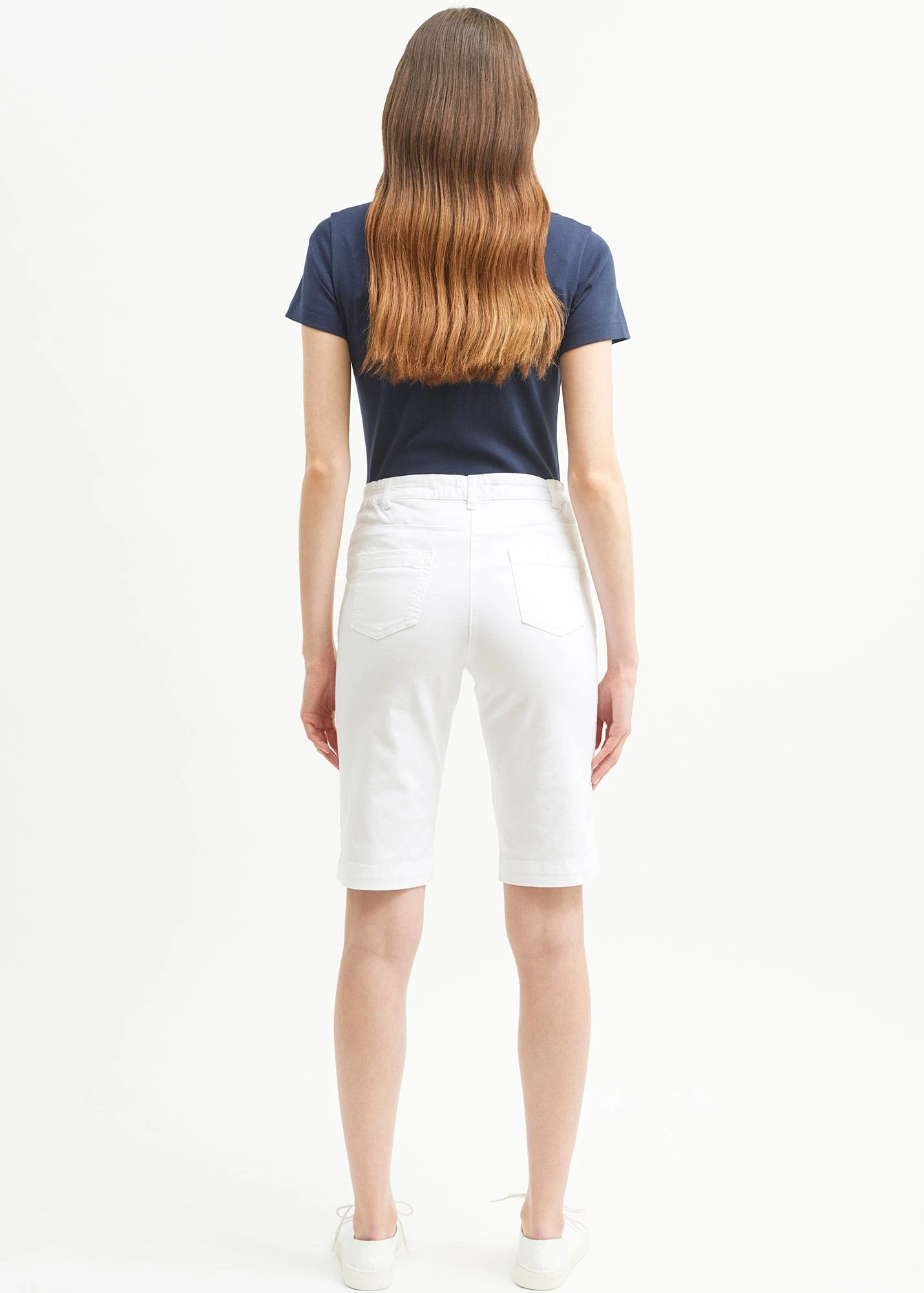 Bermuda en satin de coton élastiqué à la taille. Poches italiennes devant et poches plaquées au dos