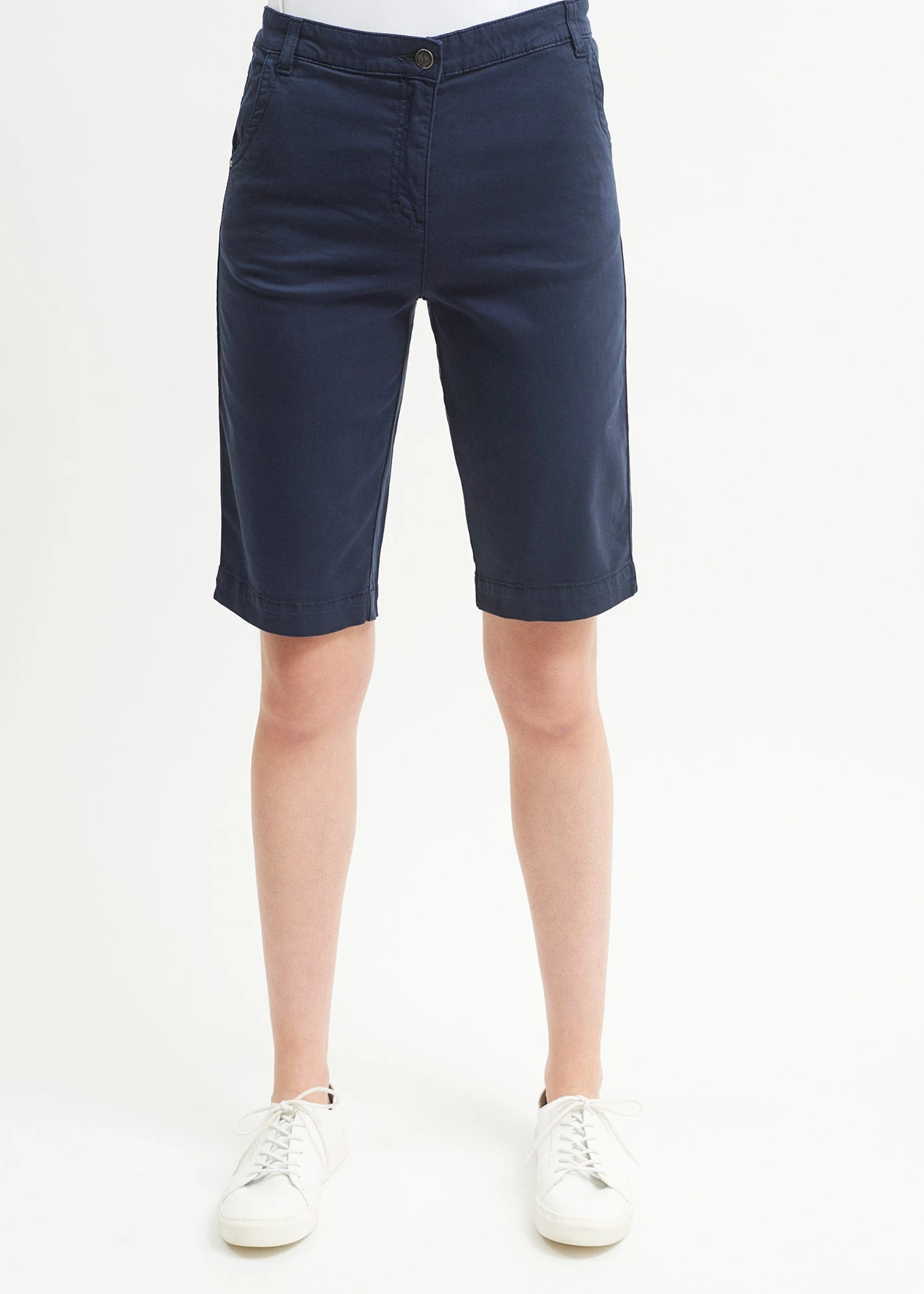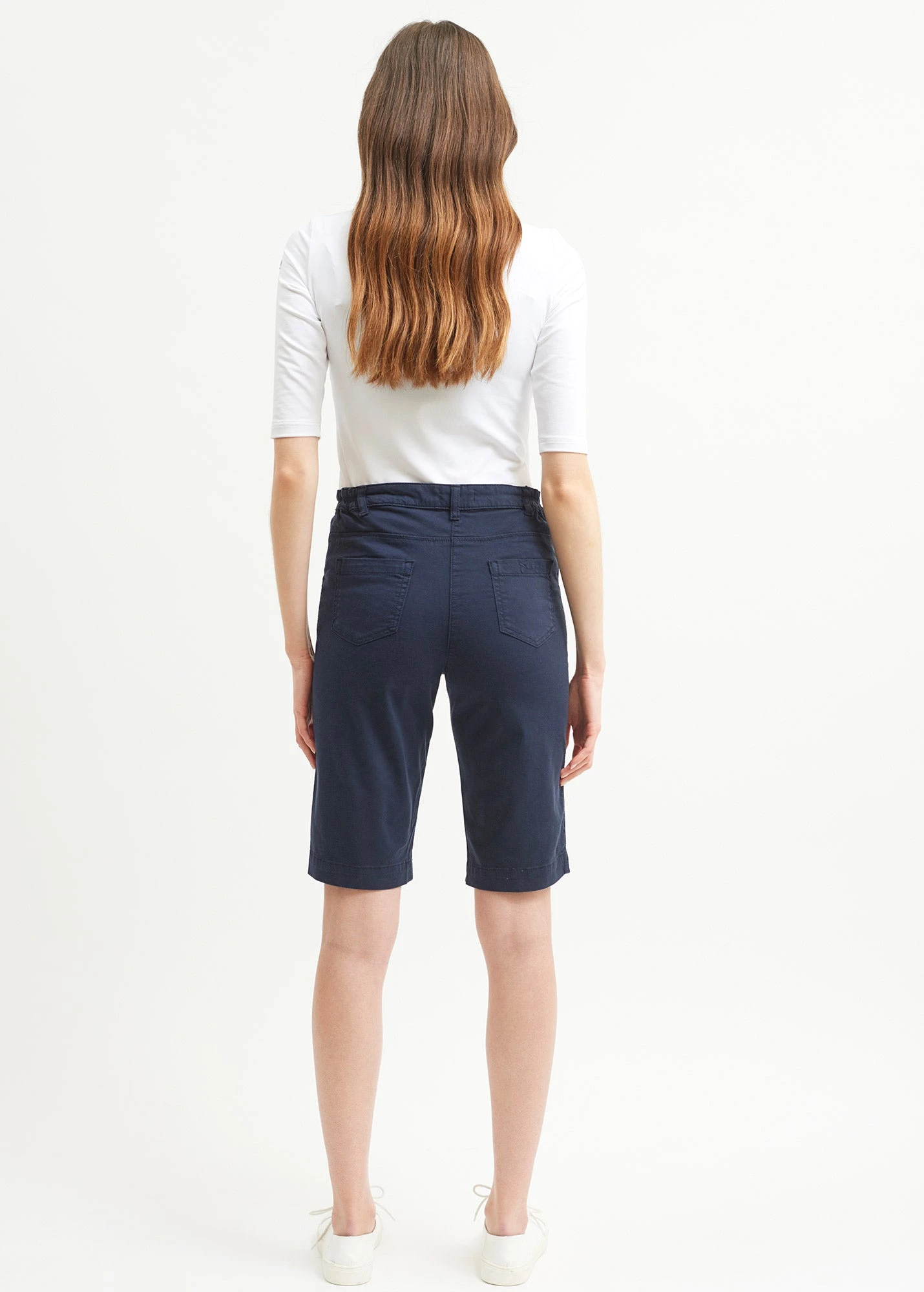 Bermuda en satin de coton élastiqué à la taille. Poches italiennes devant et poches plaquées au dos