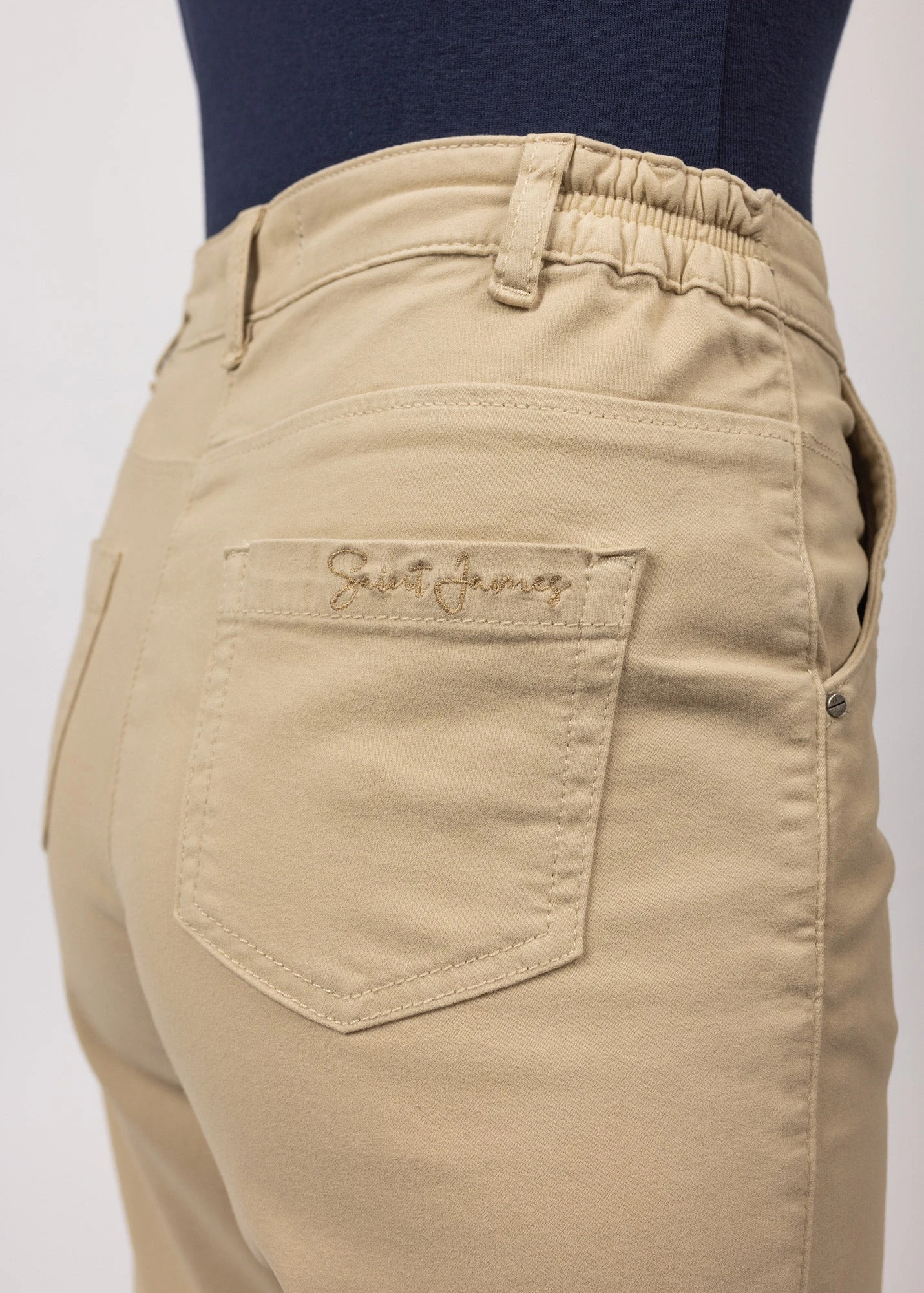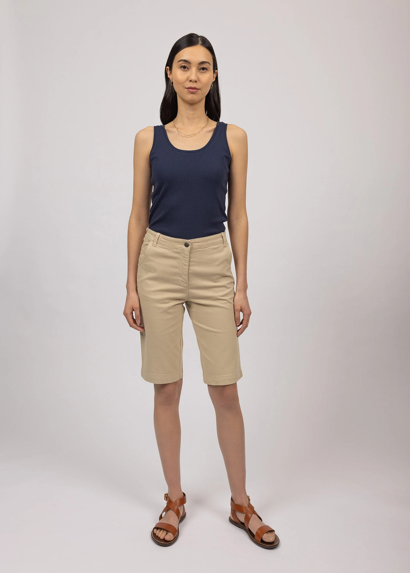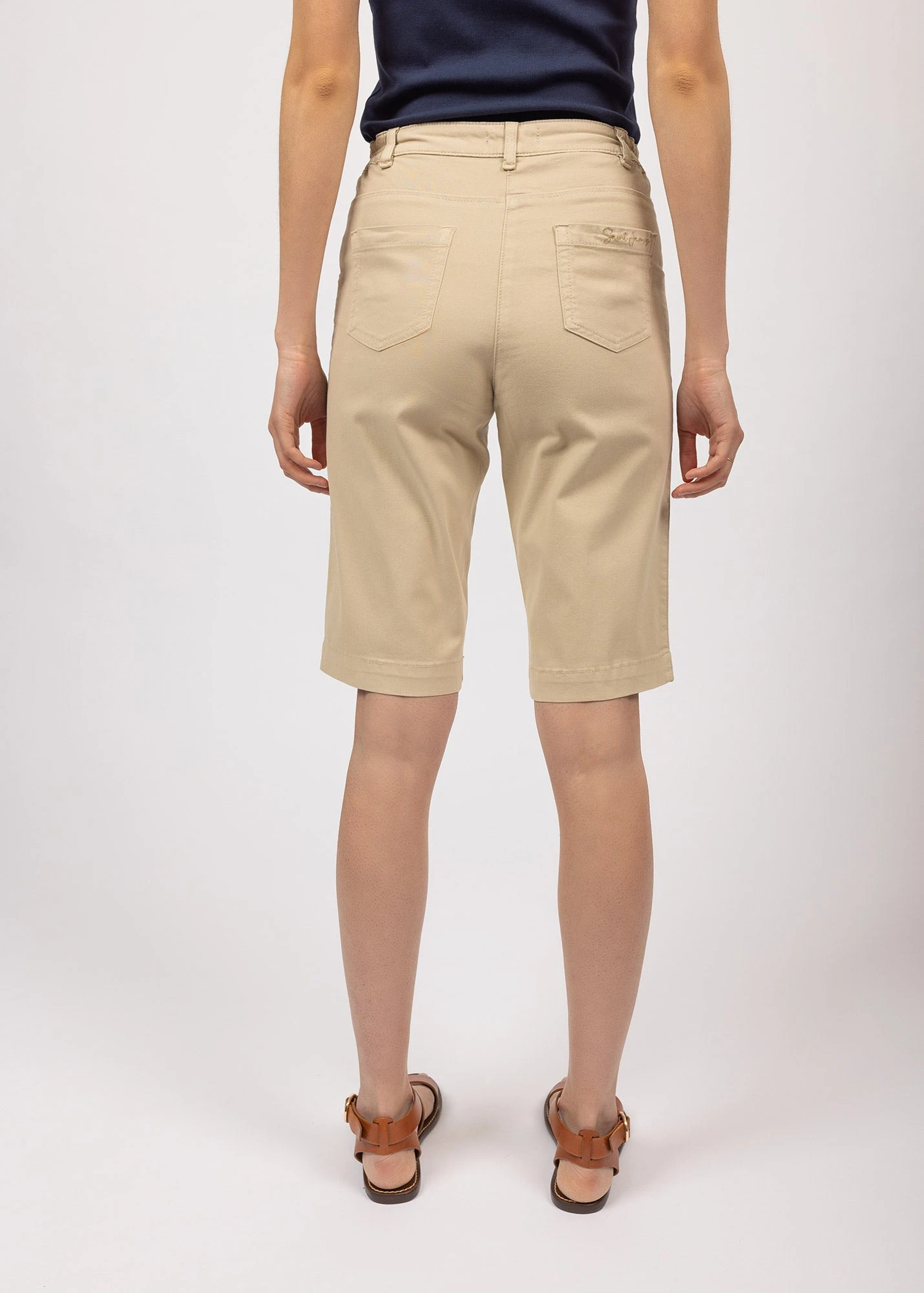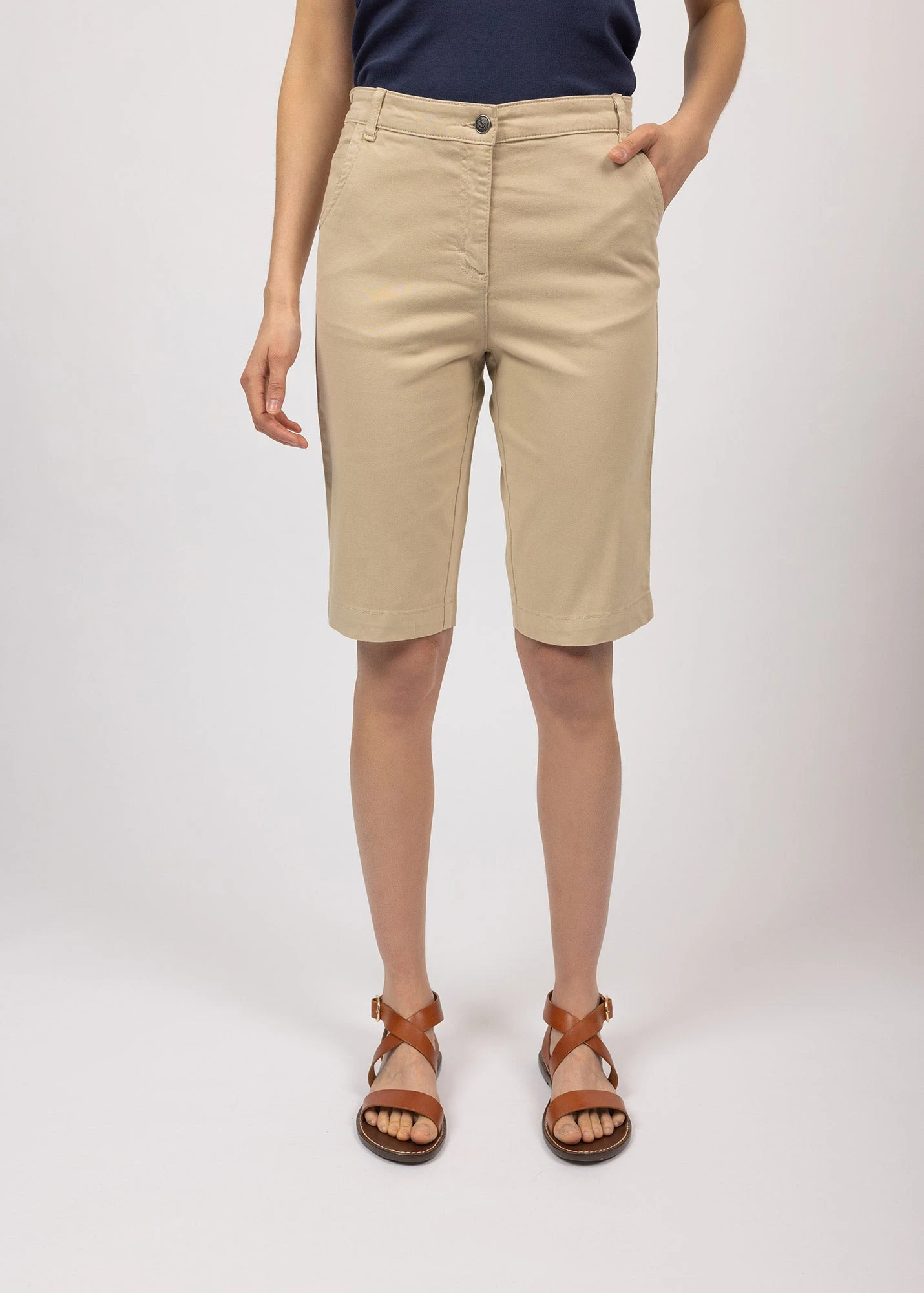 Bermuda en satin de coton élastiqué à la taille. Poches italiennes devant et poches plaquées au dos