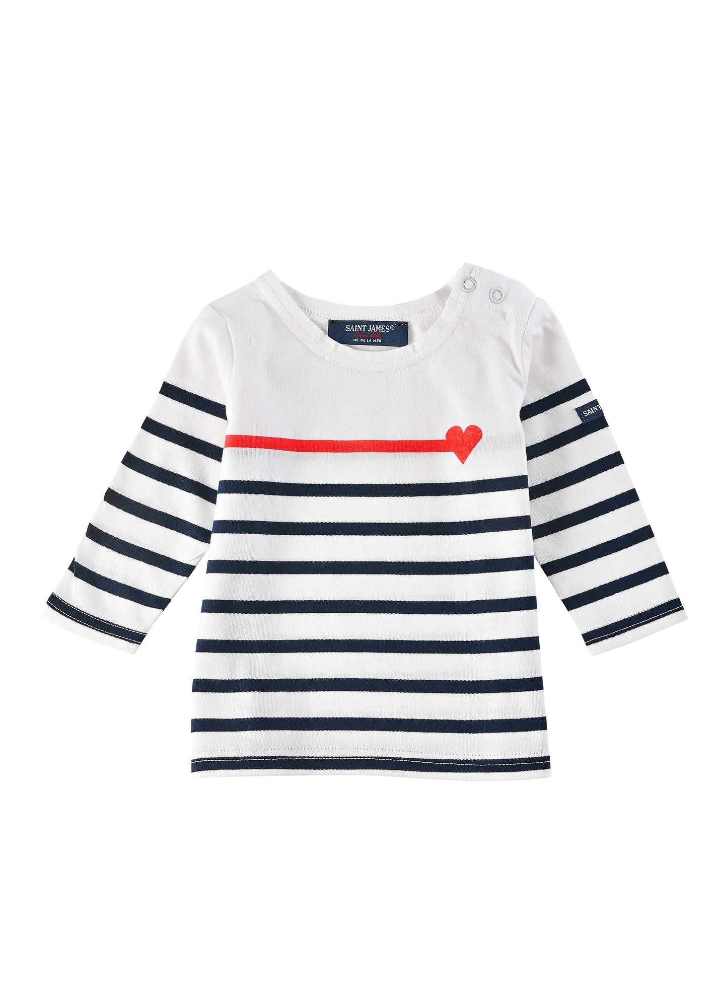 Pour célébrer une naissance, ce coffret cadeau est idéal : il contient un t-shirt en coton rayé, agrémenté d’un petit coeur rouge.