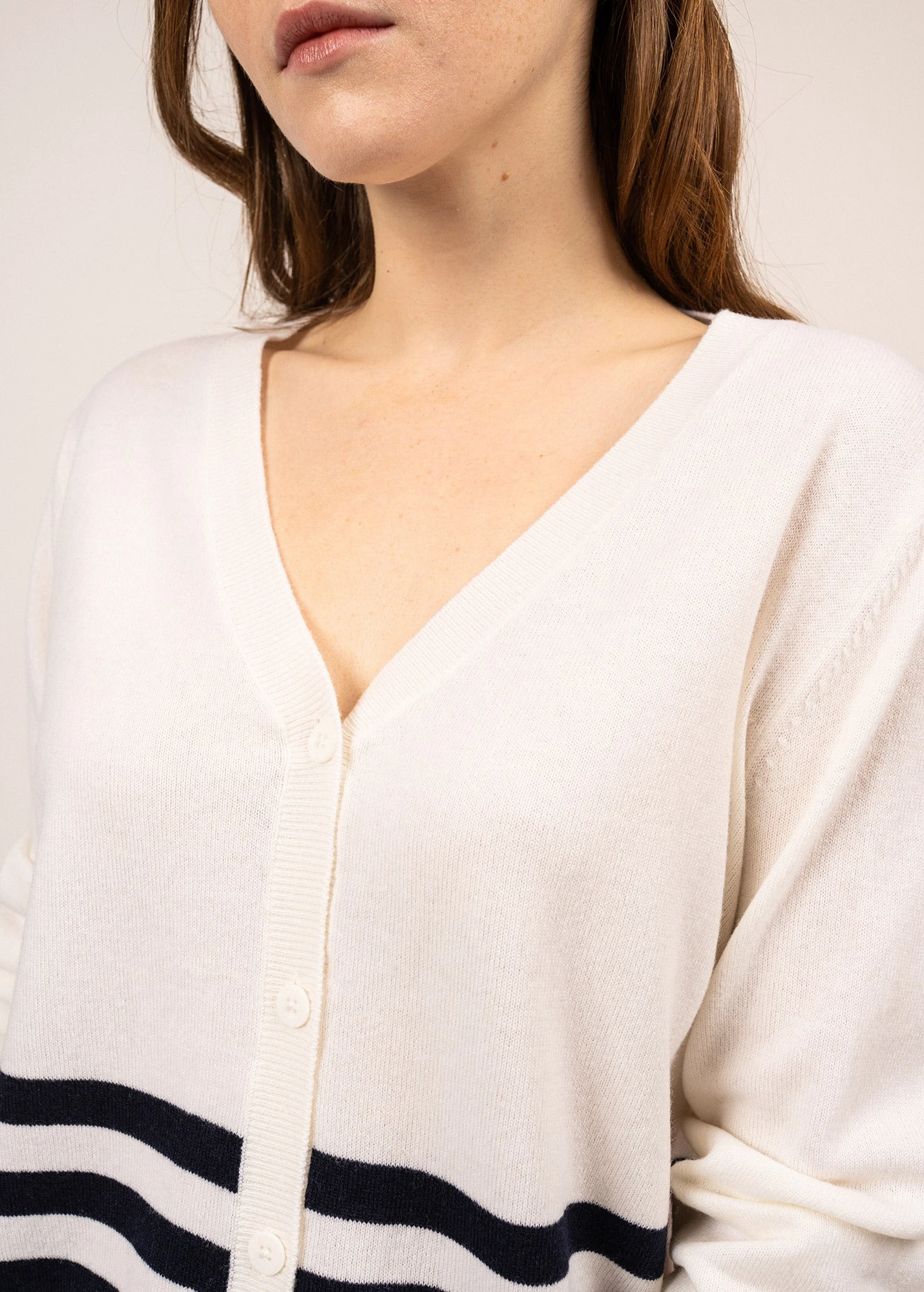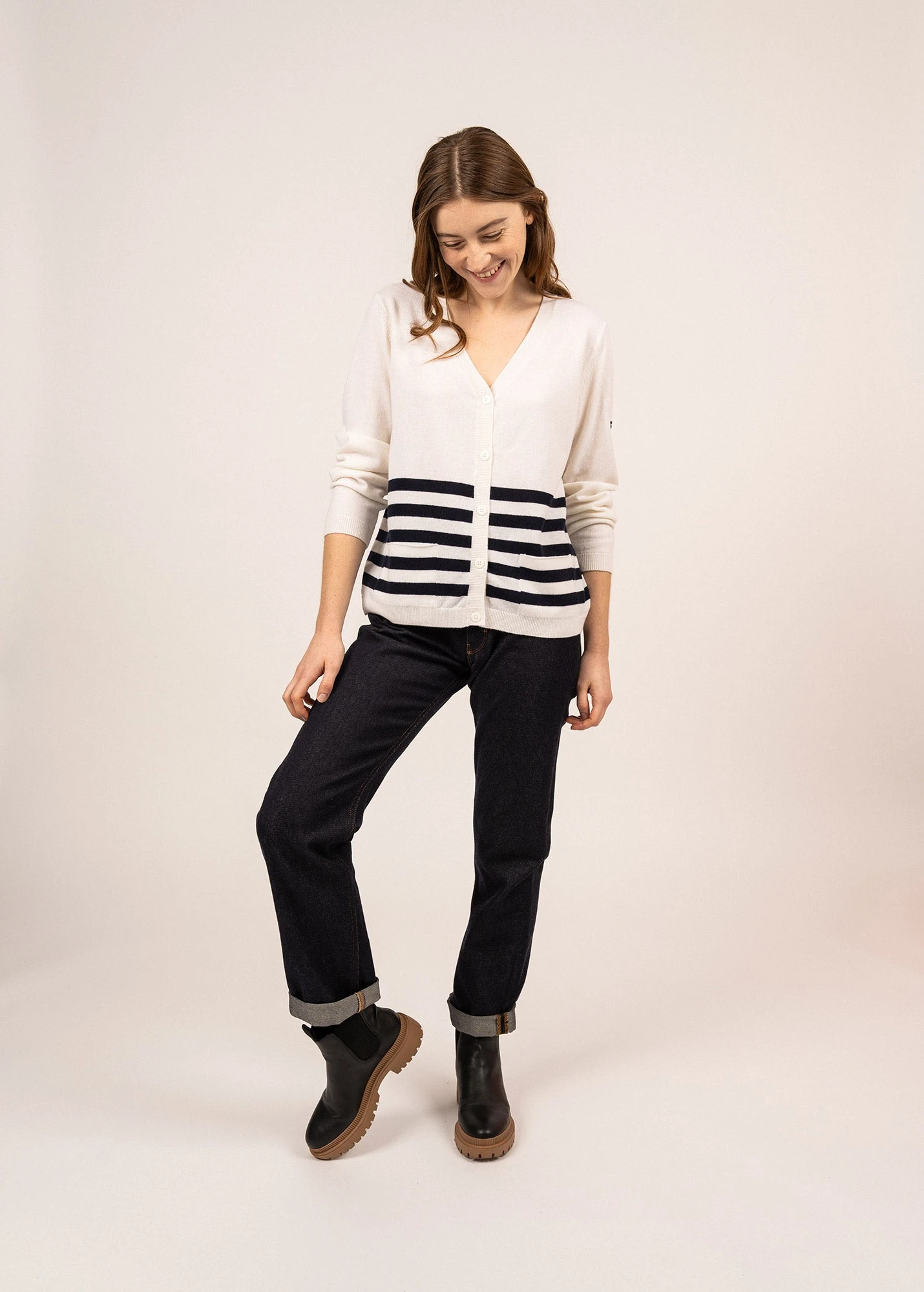 Profitez du confort du cachemire et de la chaleur de la laine avec le joli gilet Ontario. On aime son col V, féminin et élégant, ainsi que ses poches plaquées à l’avant. Portez le sur un t-shirt, un débardeur, une blouse, ou bien à même la peau pour lui apporter une touche moderne. En version rayée ou unie, il vous suivra tout l’hiver.