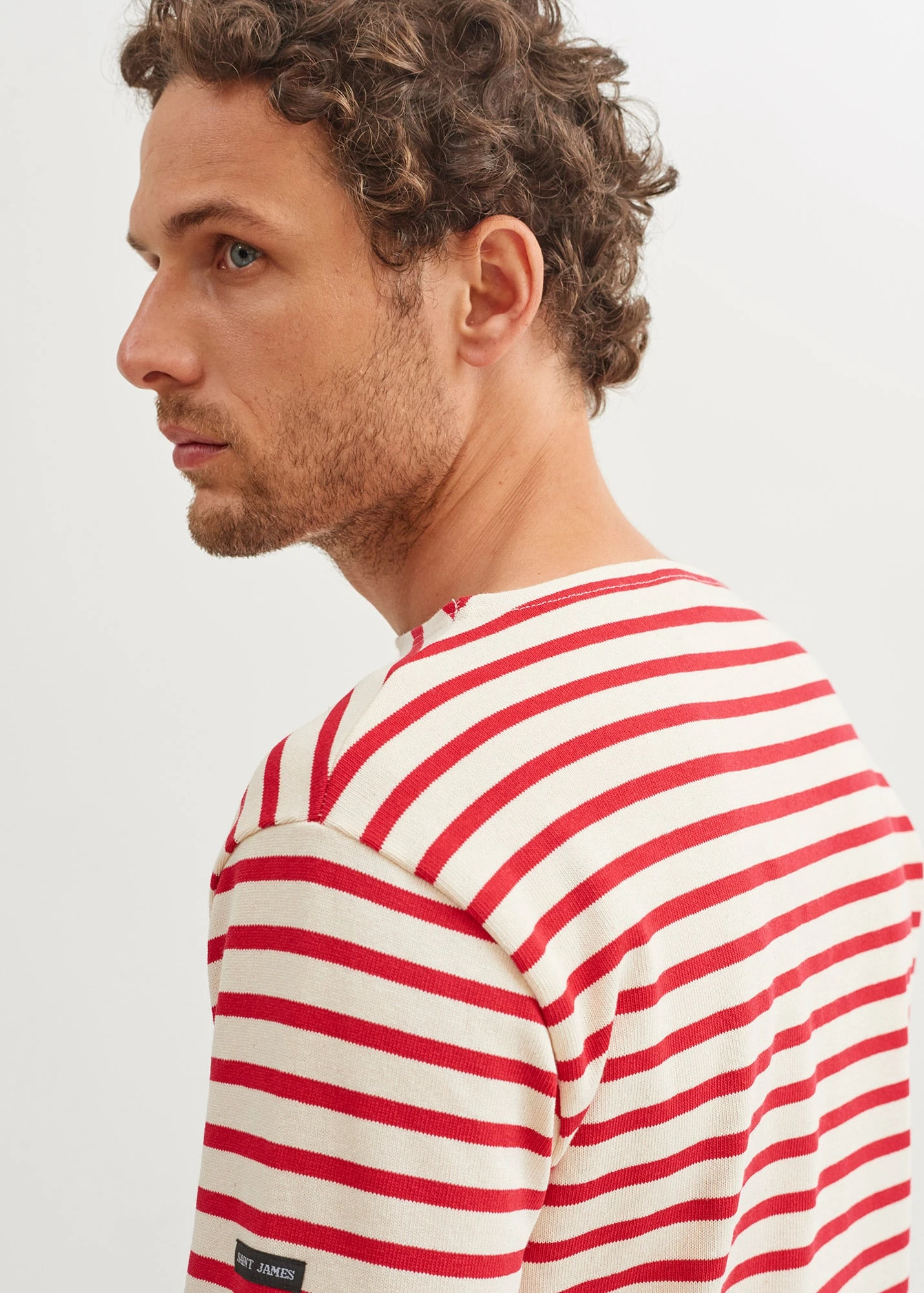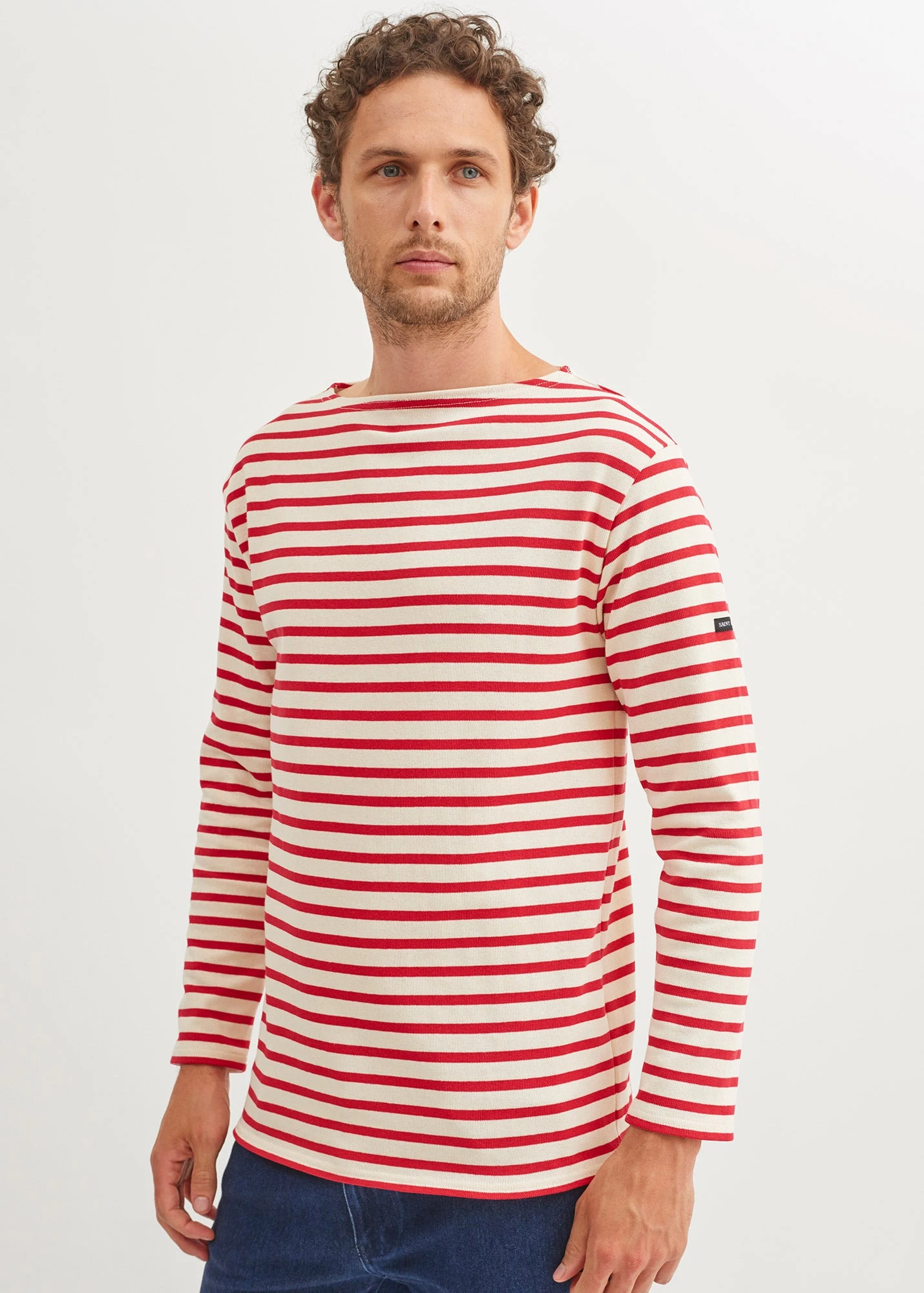La marinière Guildo présente un aspect légèrement rustique du au coton cardé, la forme « carré » du corps reprend l’idée du volume élémentaire de la marinière, l’encolure bateau finalise le vêtement traditionnel.