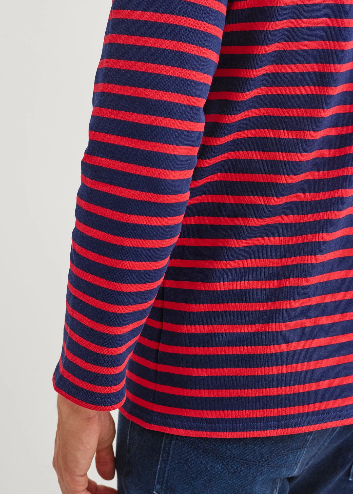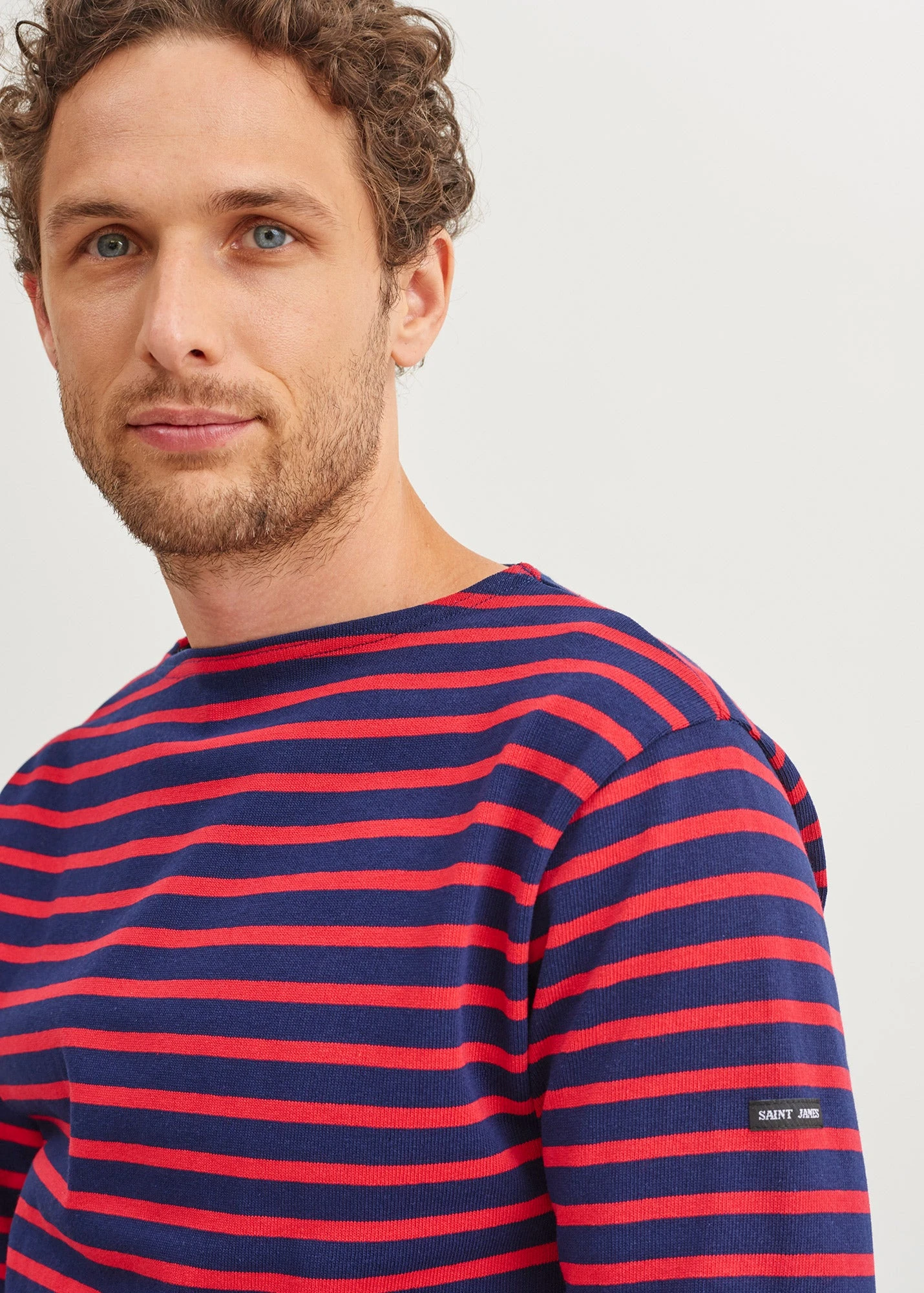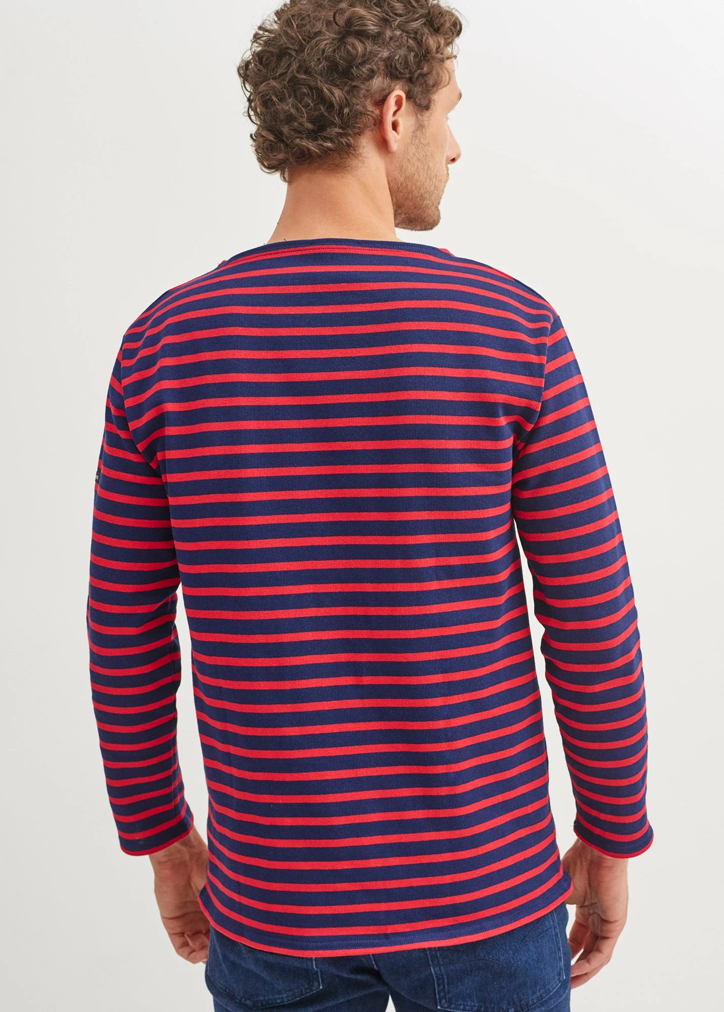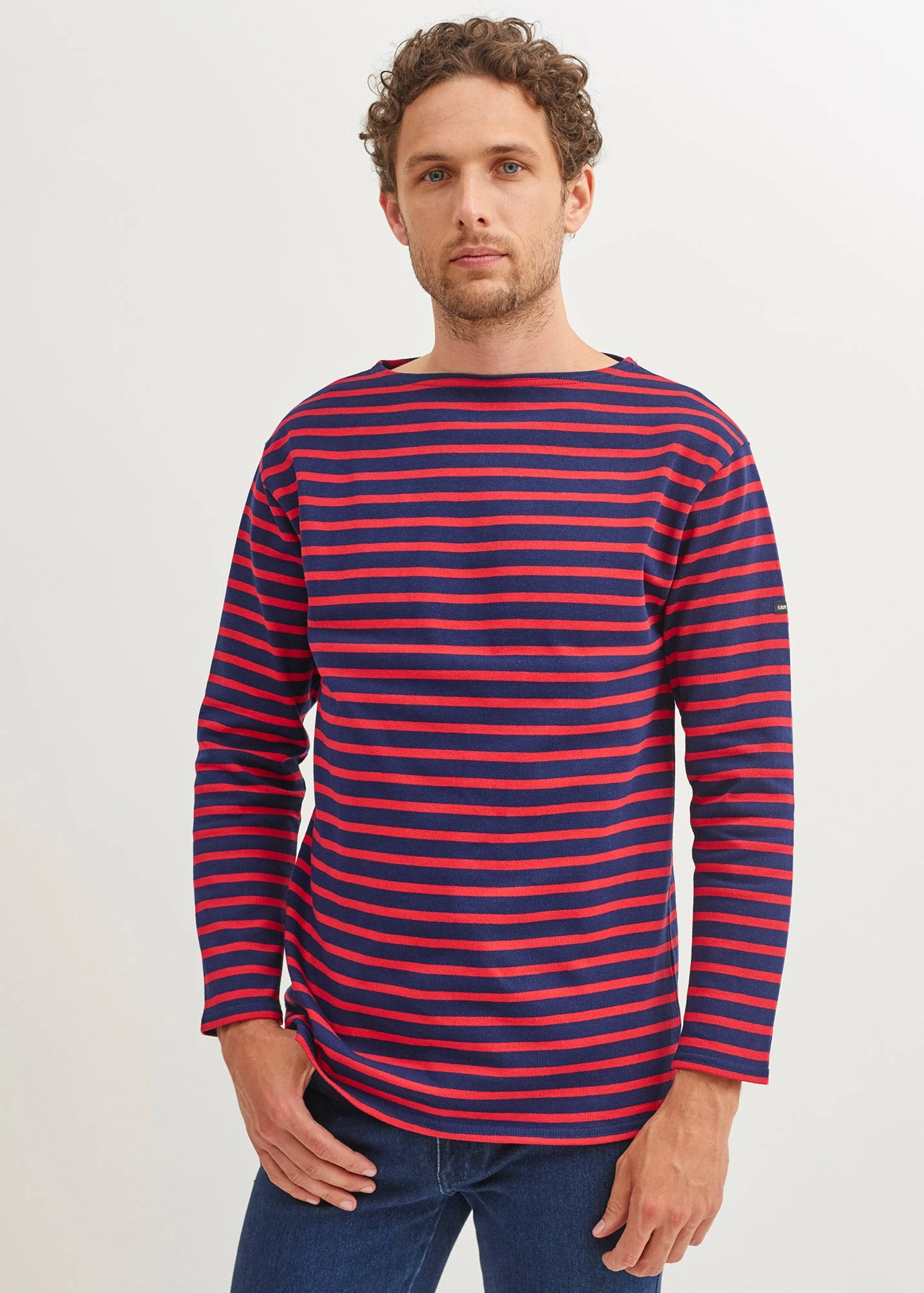 La marinière Guildo présente un aspect légèrement rustique du au coton cardé, la forme « carré » du corps reprend l’idée du volume élémentaire de la marinière, l’encolure bateau finalise le vêtement traditionnel.