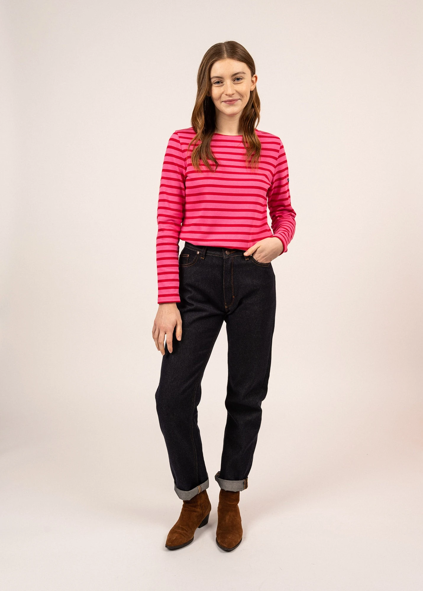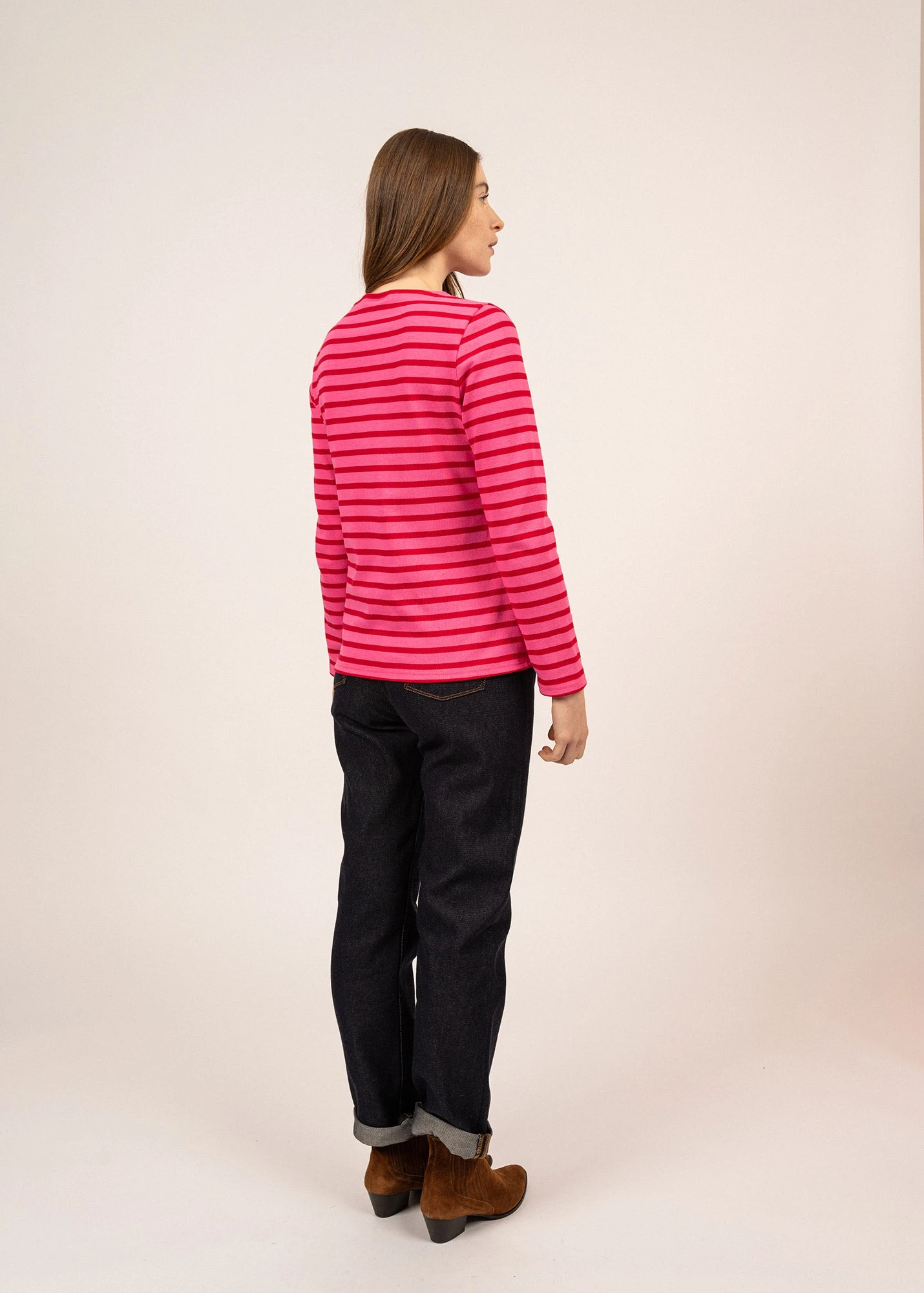 Avec sa matière authentique en coton cardé, le modèle Meridame est une interprétation de la marinière originale avec un volume plus adapté au corps des femmes et une encolure plus dégagée pour un meilleur confort au porté.