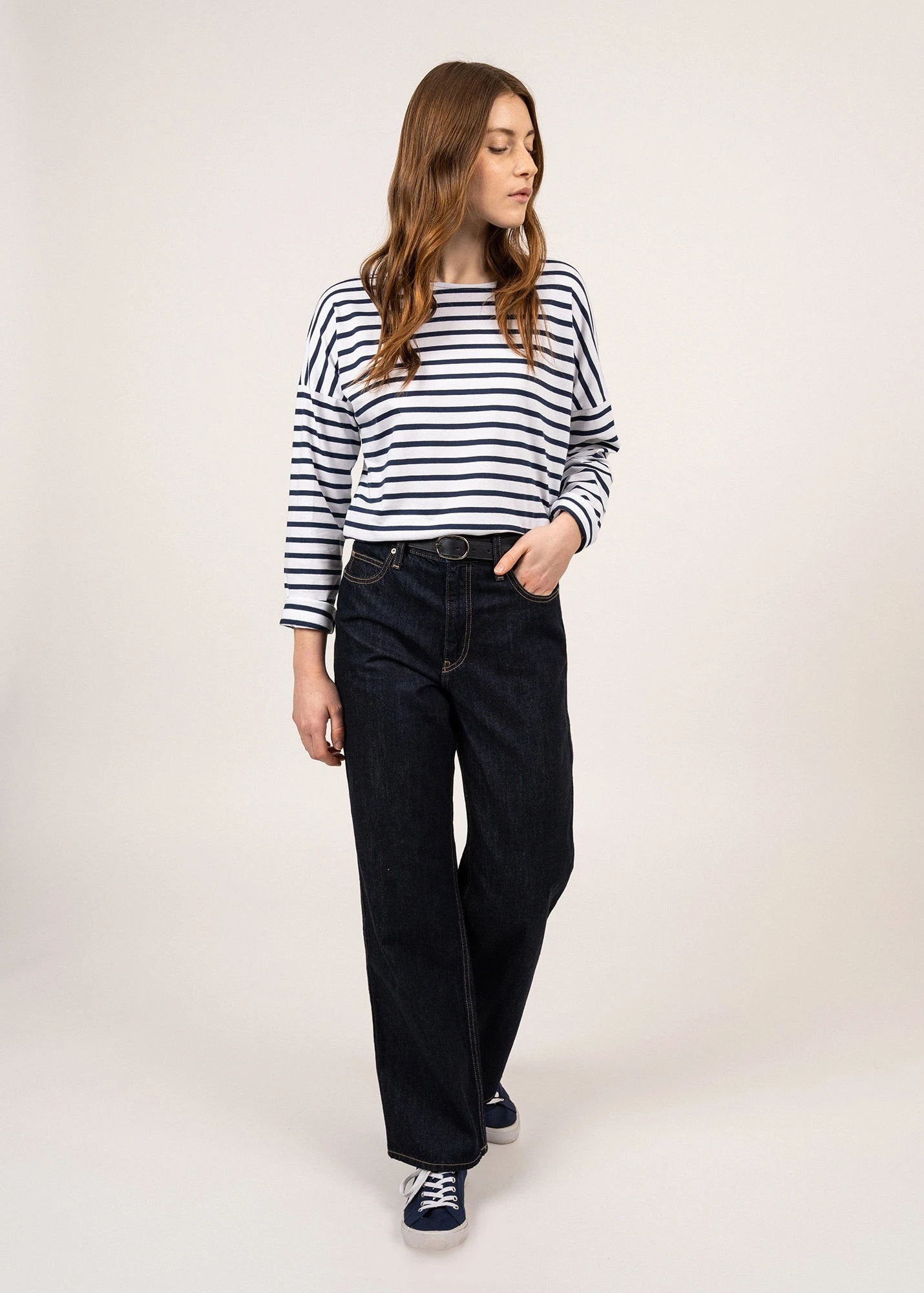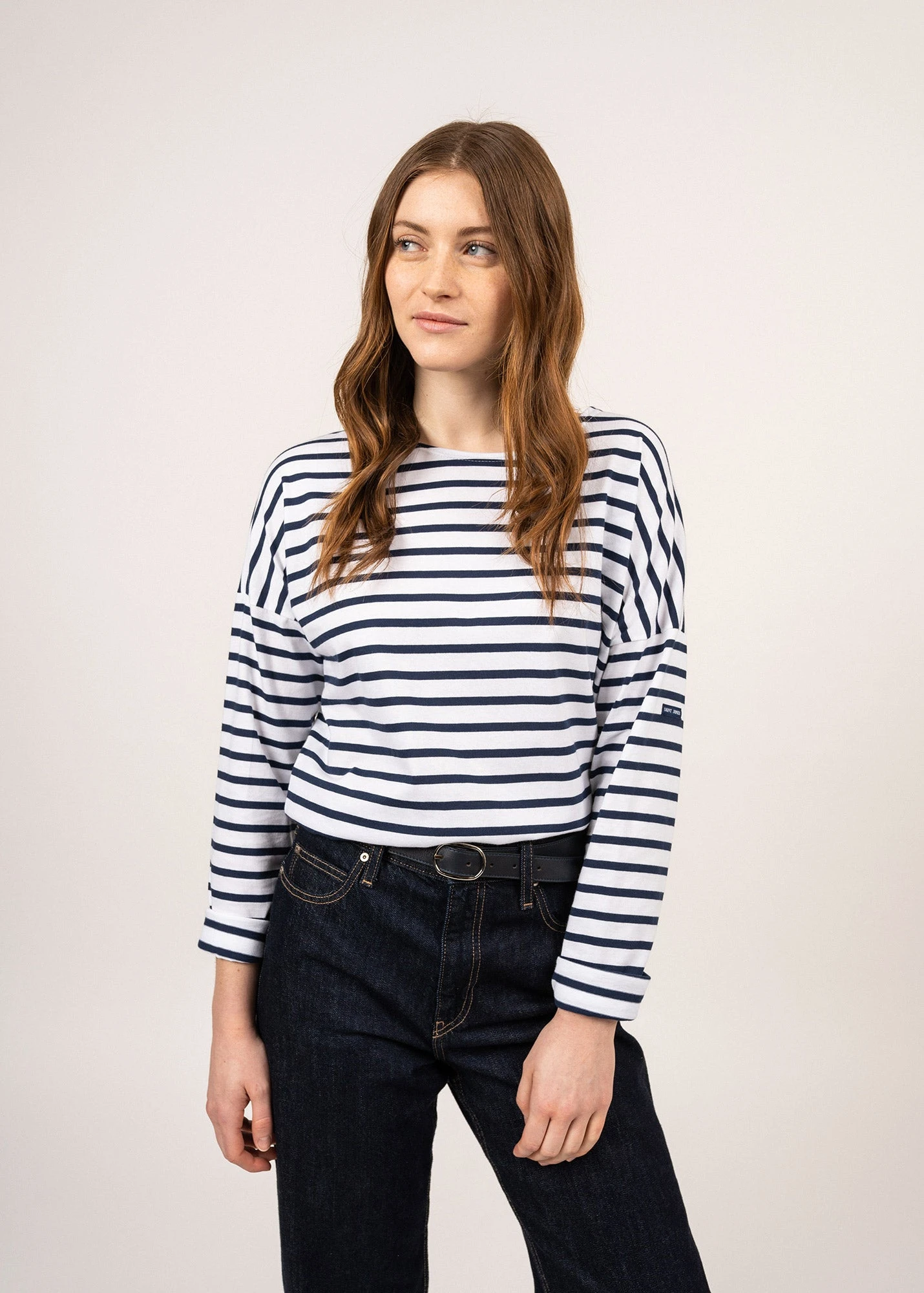 Moderne et décontractée, la marinière Minquiers Drop s’inspire de notre iconique Minquiers, mais se décline ici avec une emmanchure descendue, qui lui apporte un volume et un tombé plus contemporain. Idéal pour celles rechercahnt une marinière confortable et une coupe moins ajustée, le modèle Minquiers Drop complètera parfaitement un jean pour un look casual, ou un short pendant vos vacances estivales.