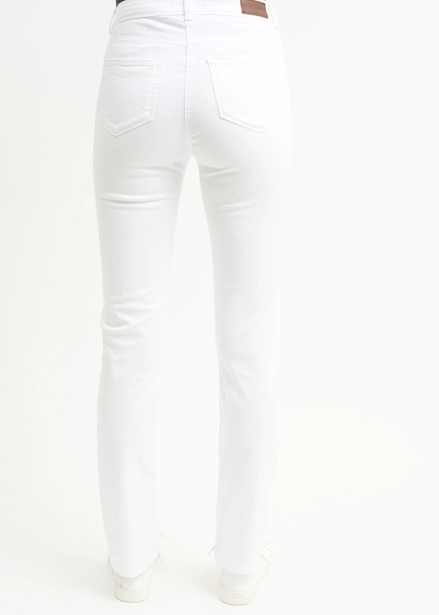 Pantalon 5 poches taille haute. Poches dos angulaires. Fond de poches en popeline rayée. Bouton en métal gravé ancre