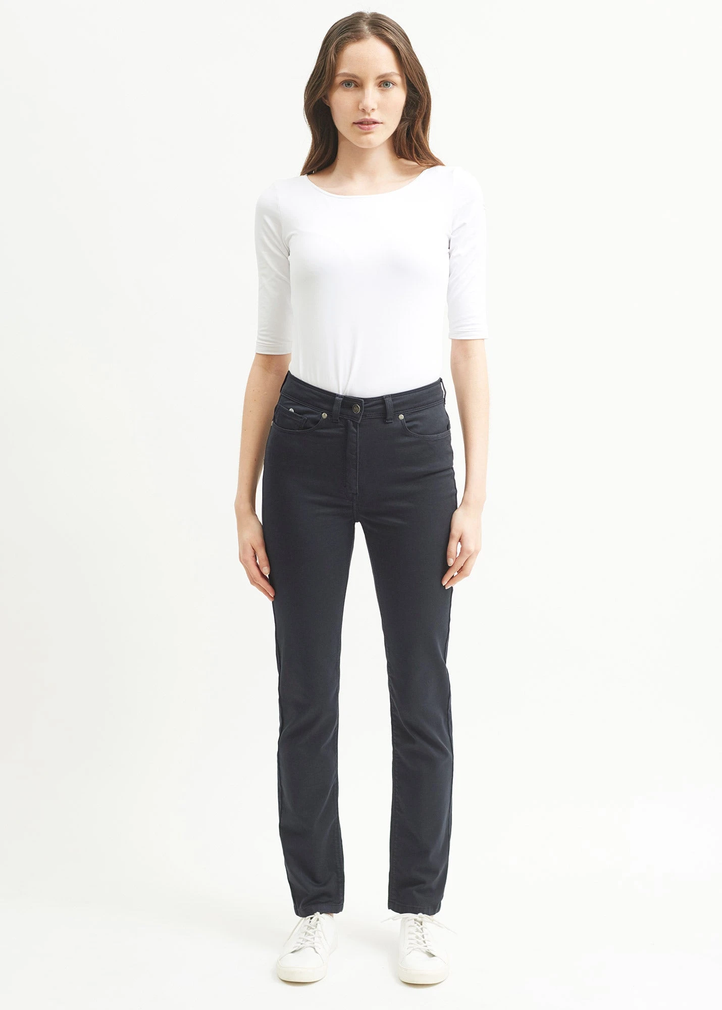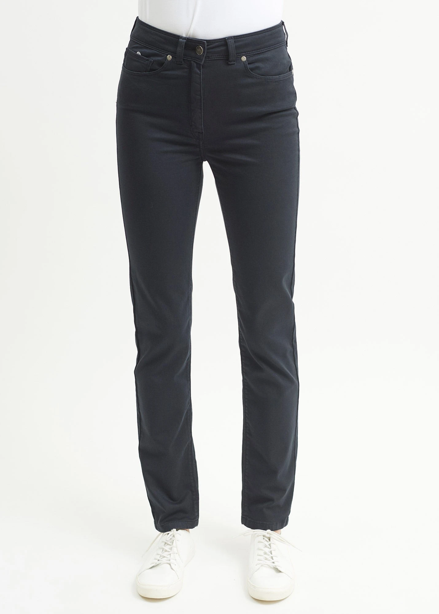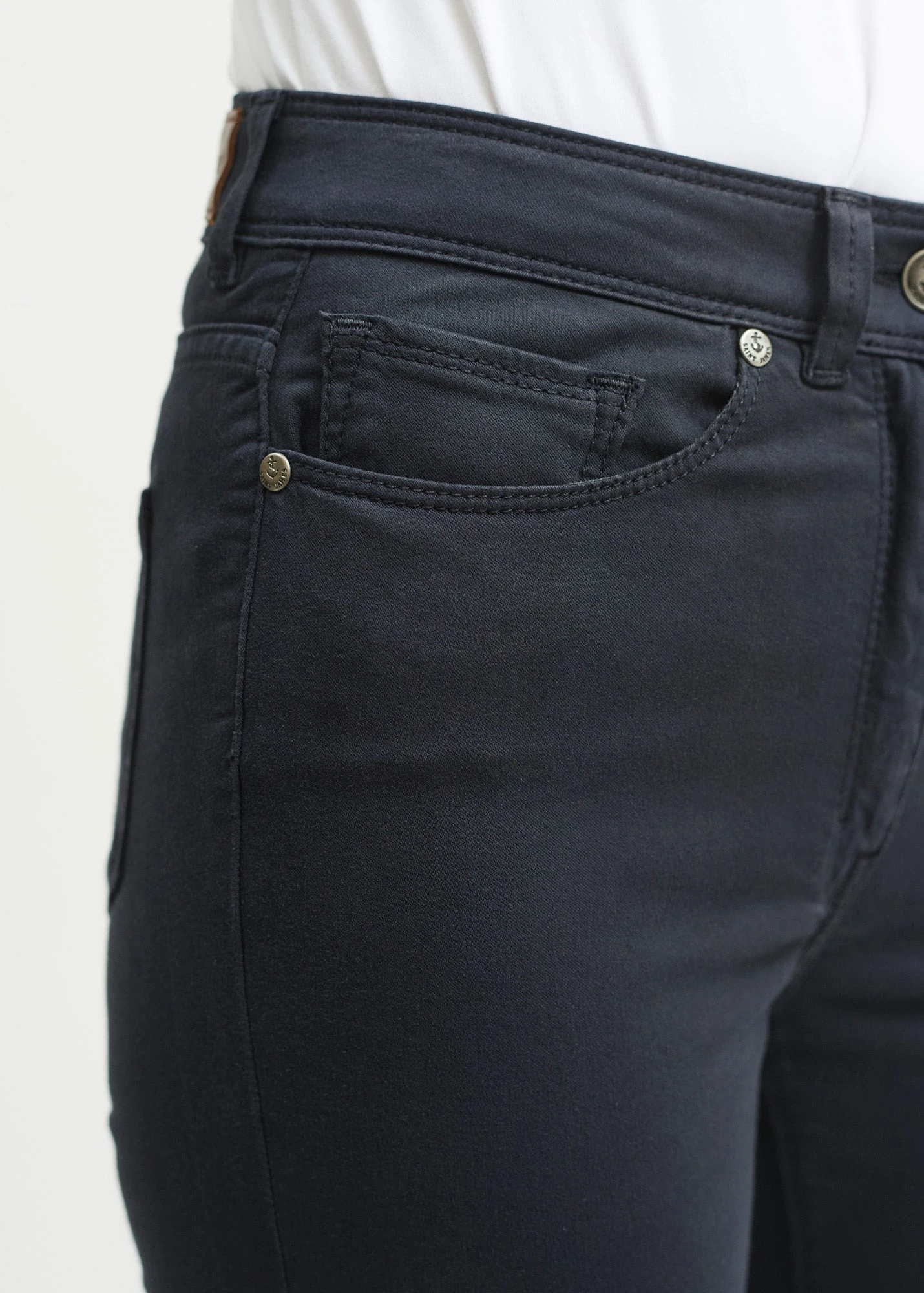 Pantalon 5 poches taille haute. Poches dos angulaires. Fond de poches en popeline rayée. Bouton en métal gravé ancre
