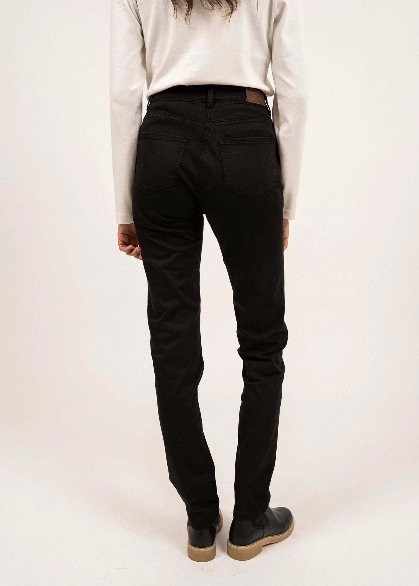 Pantalon 5 poches taille haute. Poches dos angulaires. Fond de poches en popeline rayée. Bouton en métal gravé ancre