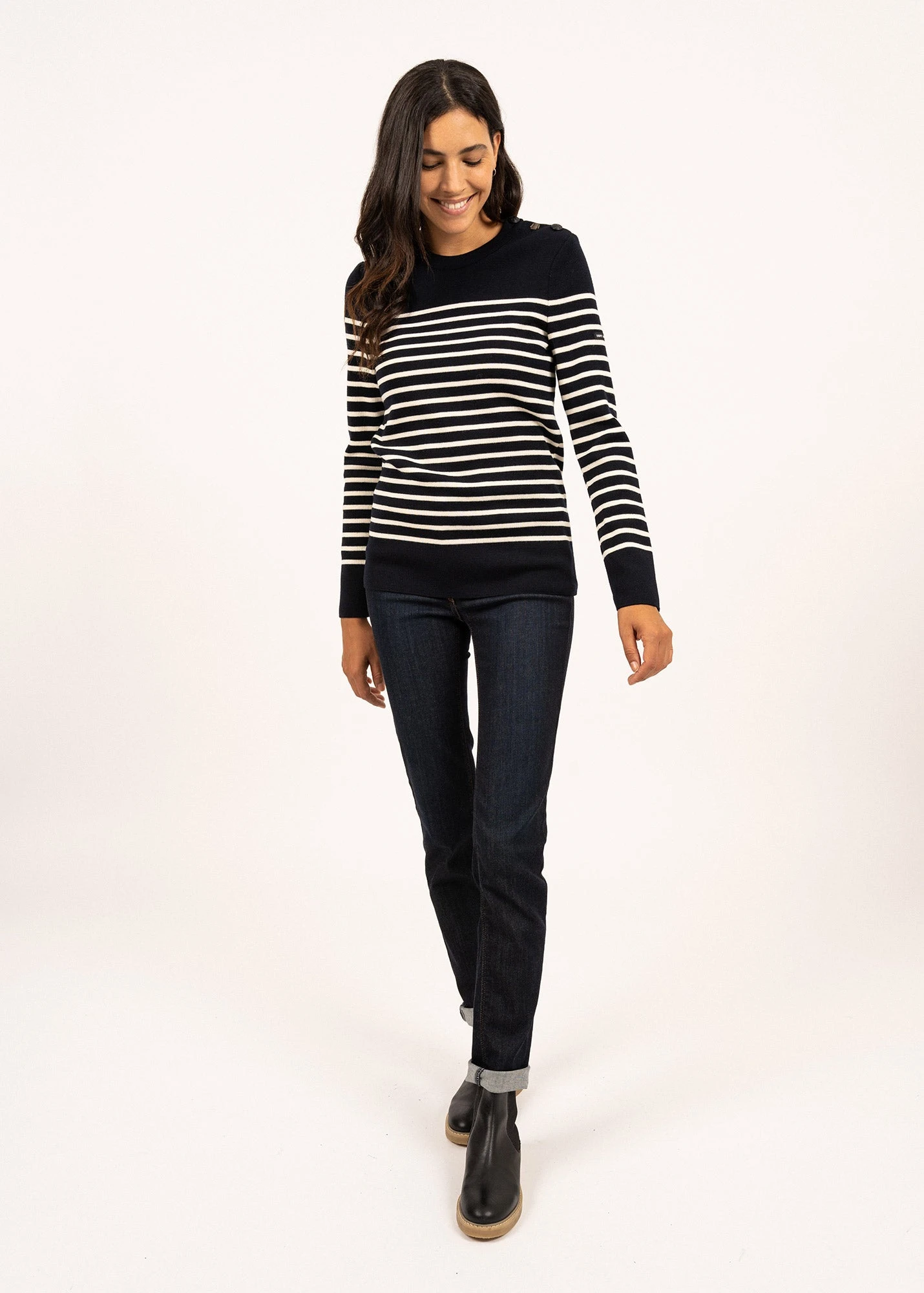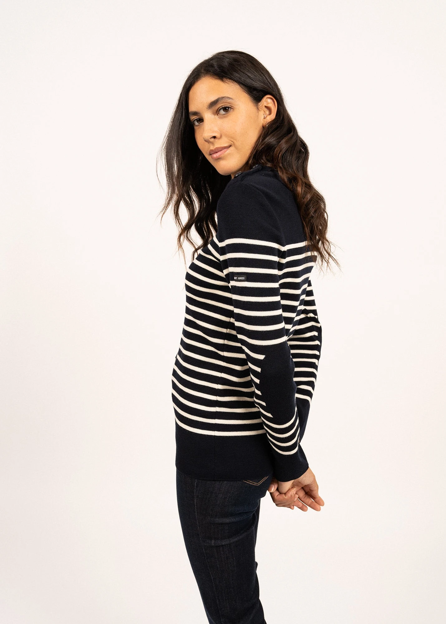 Inspiré de notre héritage marin, le pull en laine Brégançon est un incontournable du vestiaire SAINT JAMES. Tricoté dans nos Ateliers à Saint-James, sa coupe droite et sa composition 100% laine en font une pièce confortable, idéale pour celles cherchant un pull marin moins près du corps que notre traditionnel Marée. Ses coudières et son bouton en forme de marinière lui apoprtent une discrète touche d’originalité, pour un style marin revisité.