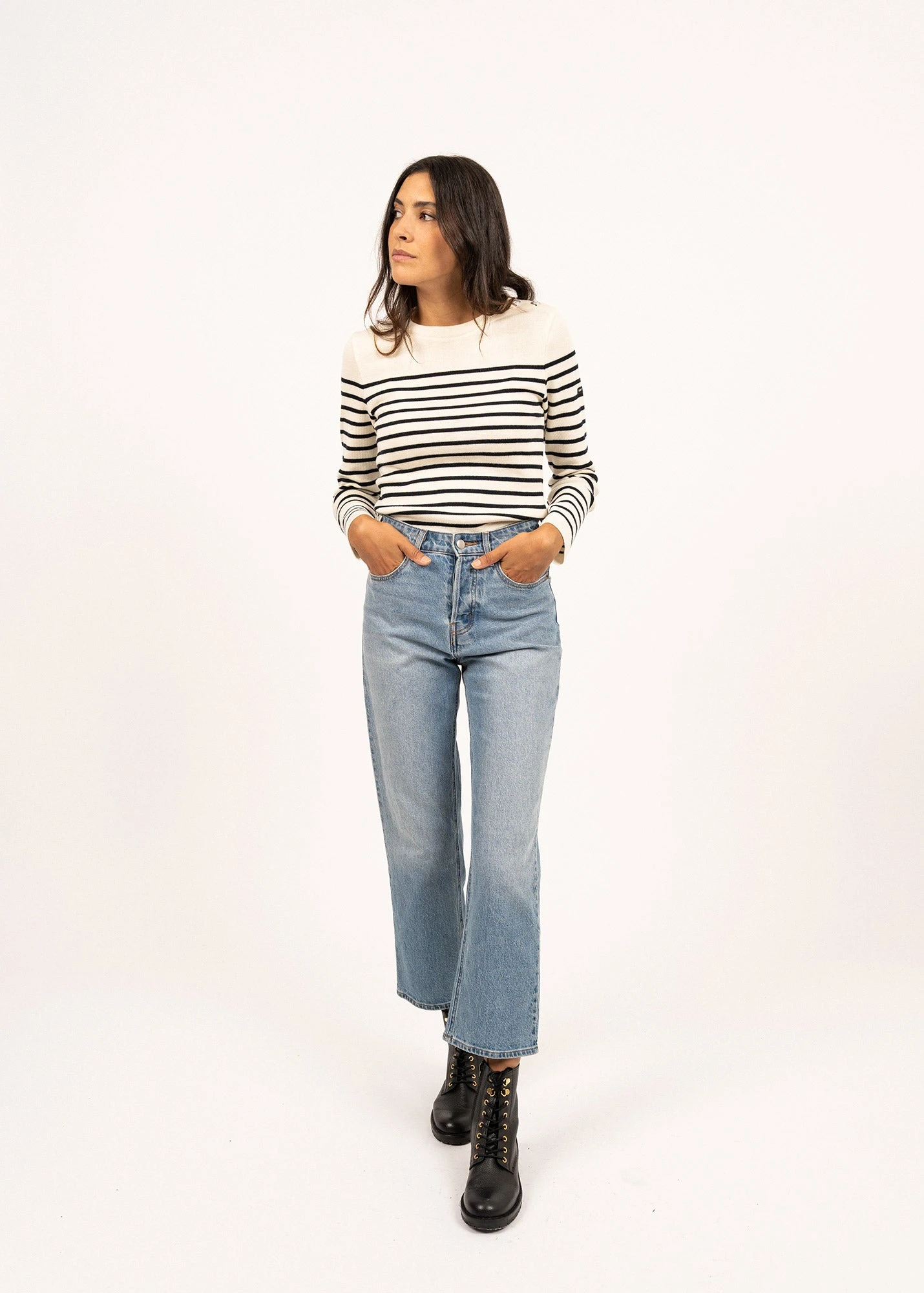 Moins lourd et plus doux que l’authentique pull marin, le pull Marée en conserve les caractéristiques esthétiques : coupe ajustée, col ras du cou et ouverture épaule. Scintillants, les boutons argentés mat sont ornés d’une ancre en relief.