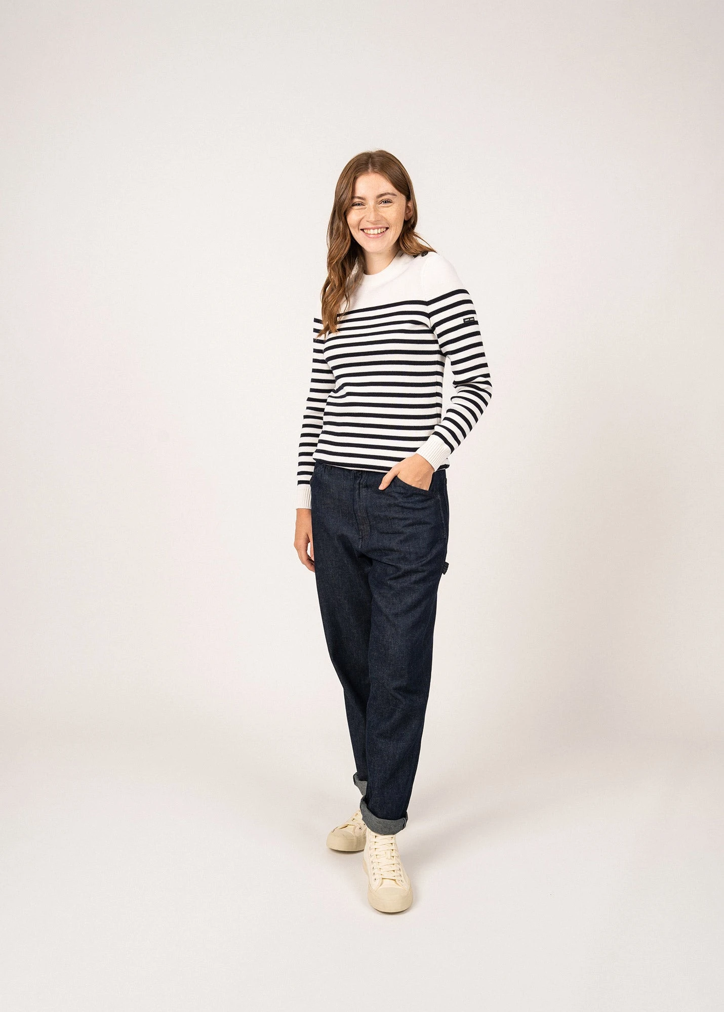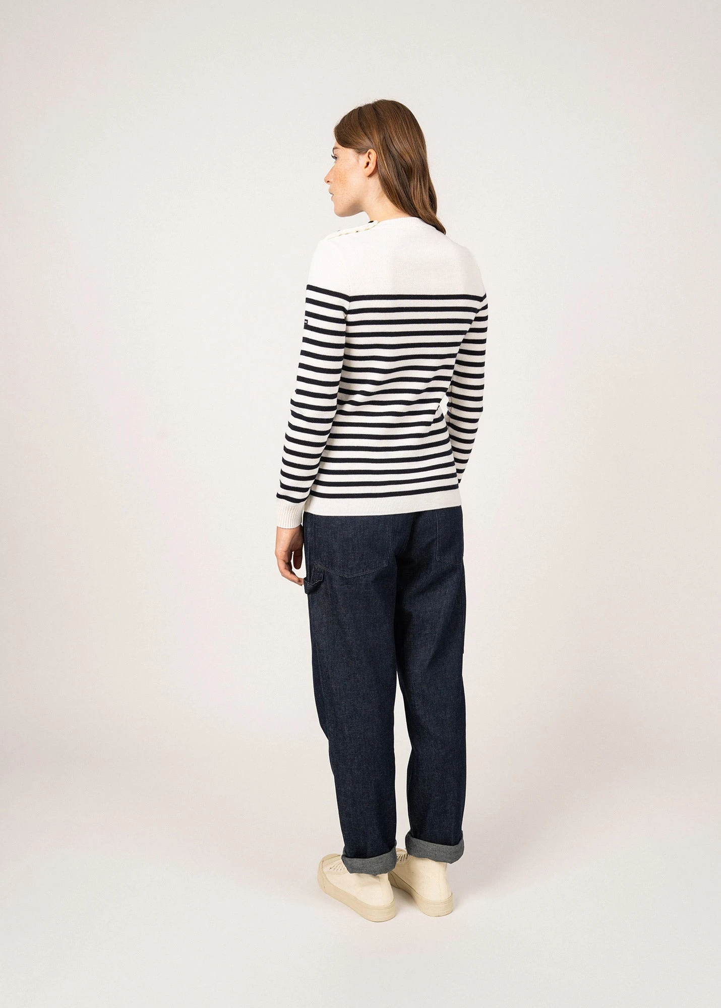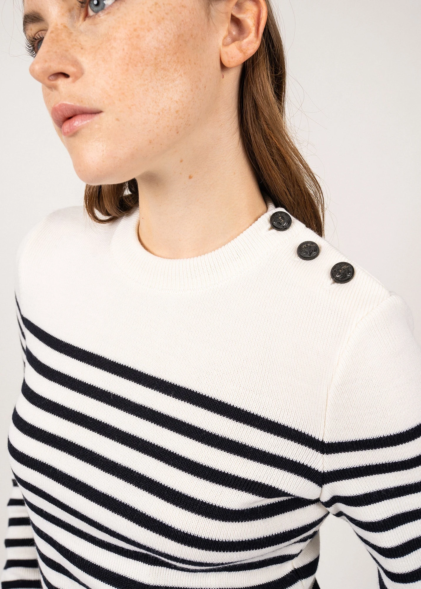 Version féminine de notre intemporel Rochefort, ce pull marin en laine est tricoté dans nos Ateliers, à Saint-James. Pour plus de confort, il reprend le fit de notre pull Brégançon, dans la laine douce du Rochefort. A l’épaule, notre classique boutonnage se pare de boutons en résine imitation corne.
