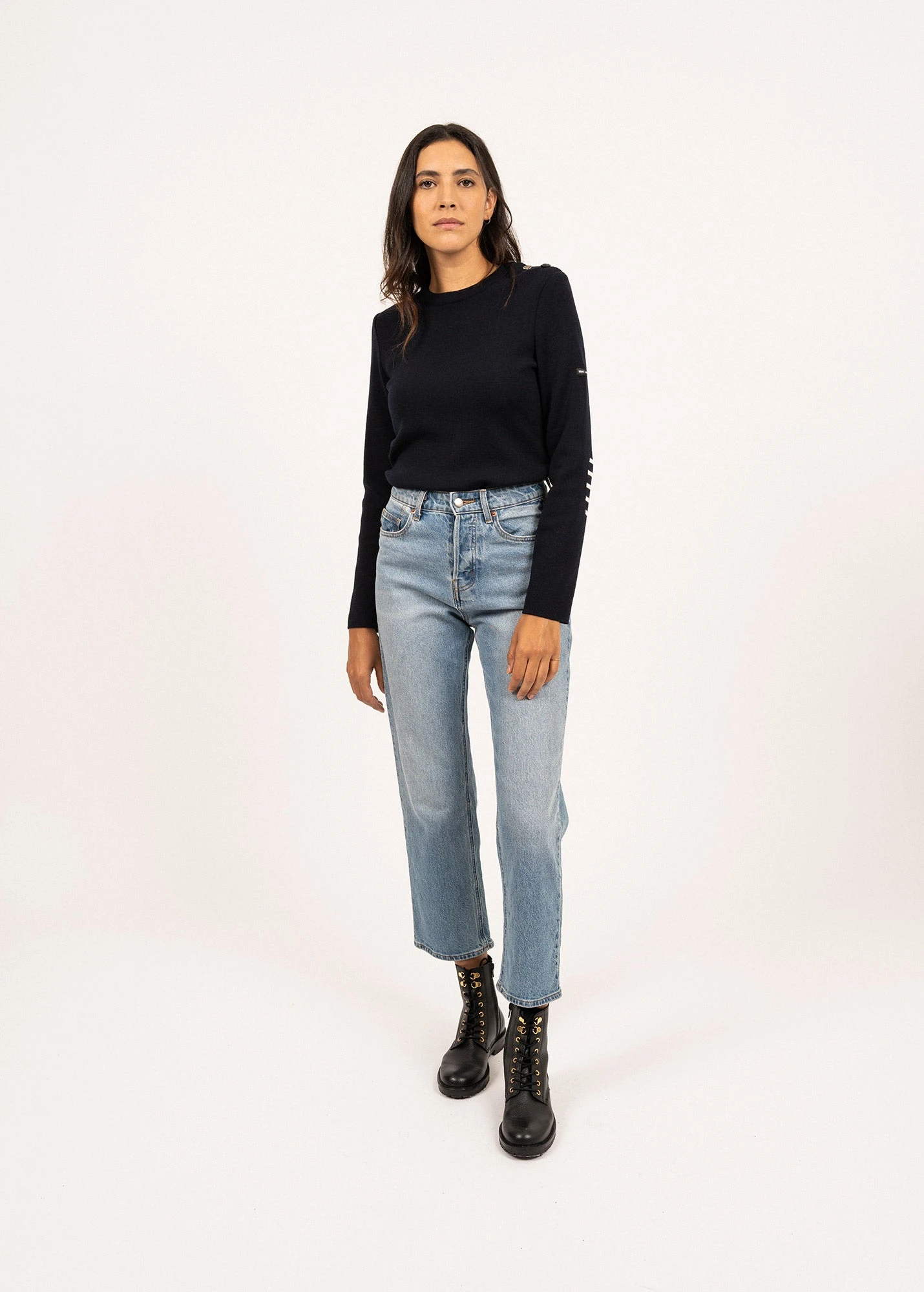 Inspiré de notre héritage marin, le pull en laine Brégançon est un incontournable du vestiaire SAINT JAMES. Tricoté dans nos Ateliers à Saint-James, sa coupe droite et sa composition 100% laine en font une pièce confortable, idéale pour celles cherchant un pull marin moins près du corps que notre traditionnel Marée. Ses coudières et son bouton en forme de marinière lui apoprtent une discrète touche d’originalité, pour un style marin revisité.