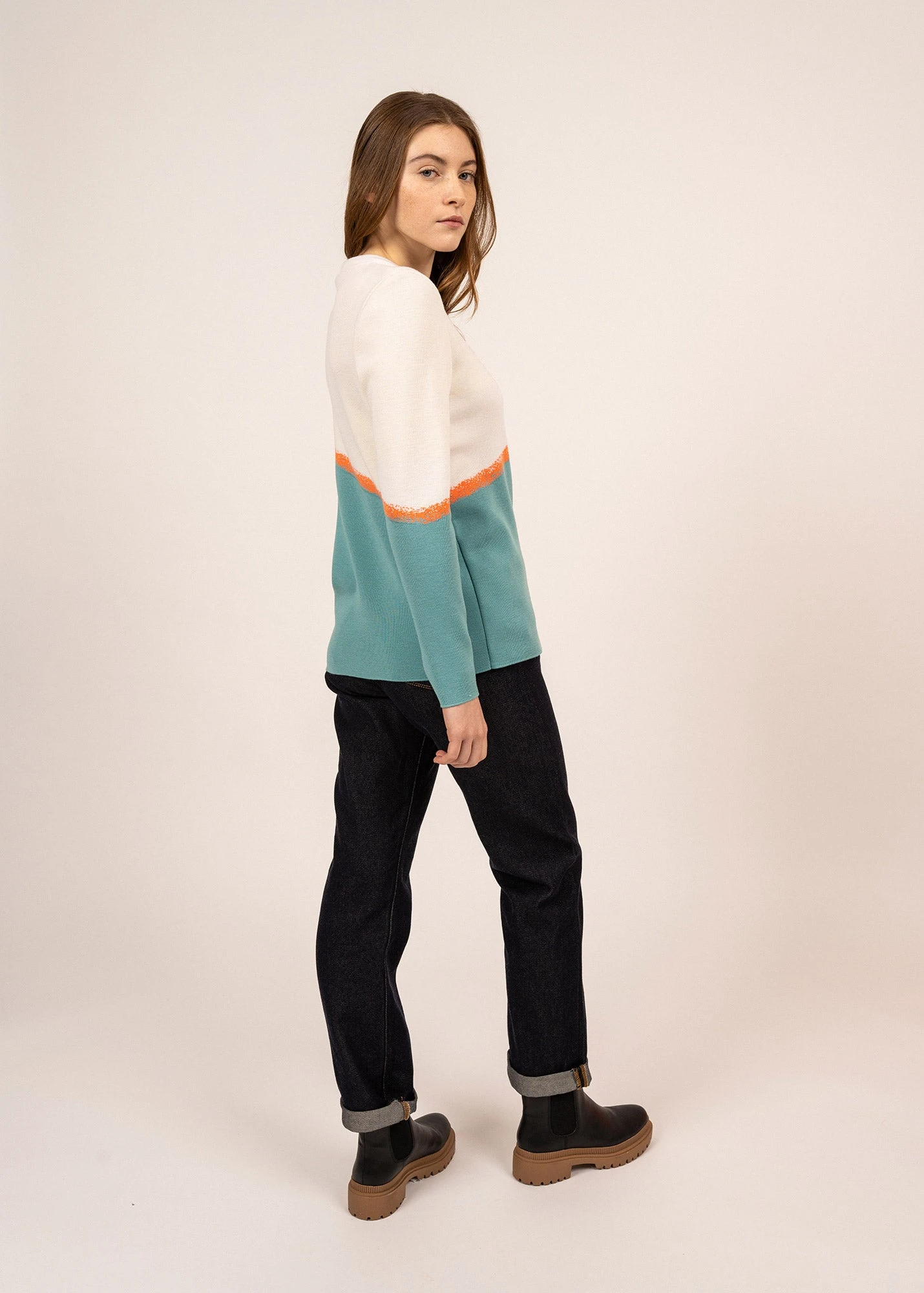 Pièce phare de la saison, le pull Espelette est un bel exemple de notre savoir-faire centenaire. Son tricotage mêlant jacquard et côte 1×1 en fait une pièce à la fois fantaisie et intemporelle, reprenant nos coloris de saison, vibrants. Confortable, à la coupe sobre, c’est une pièce idéale pour ajouter avec facilité une touche d’originalité dans votre dressing hivernal.