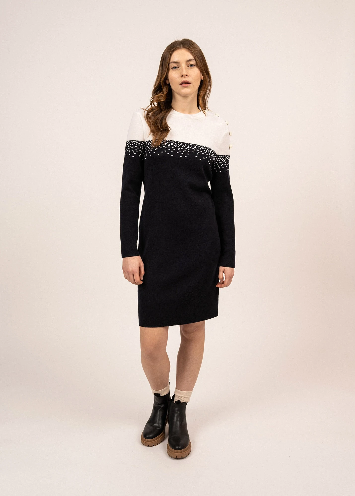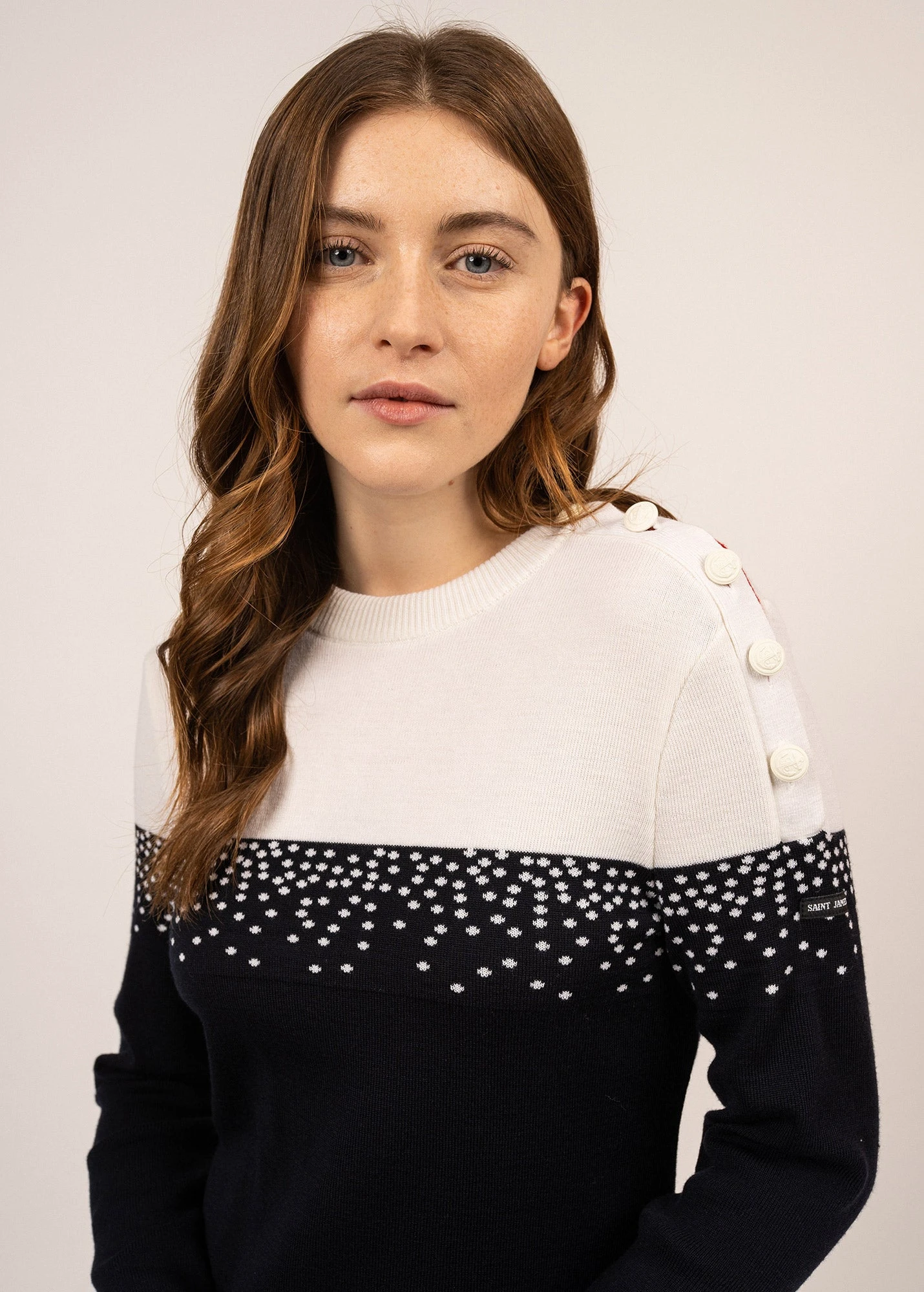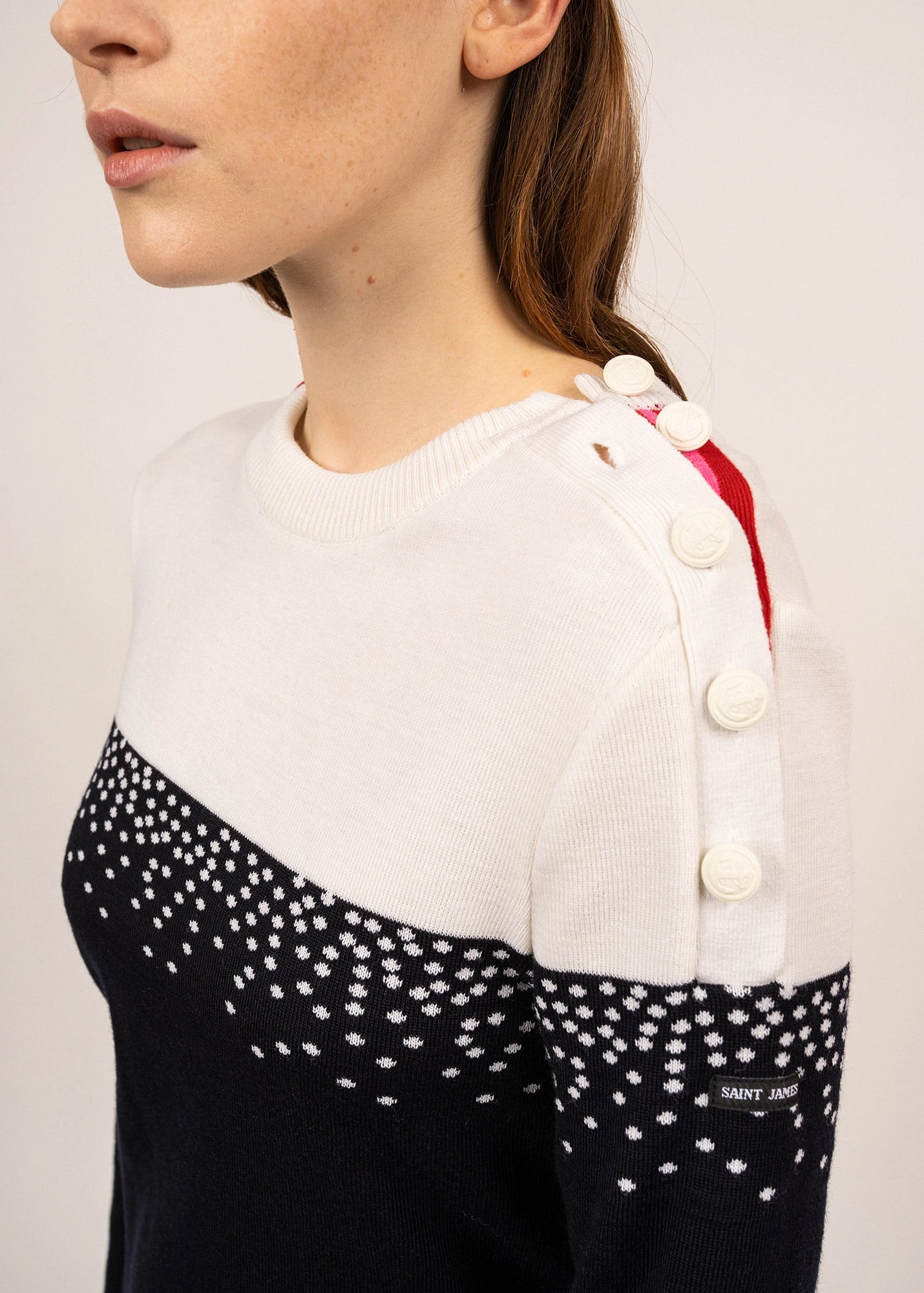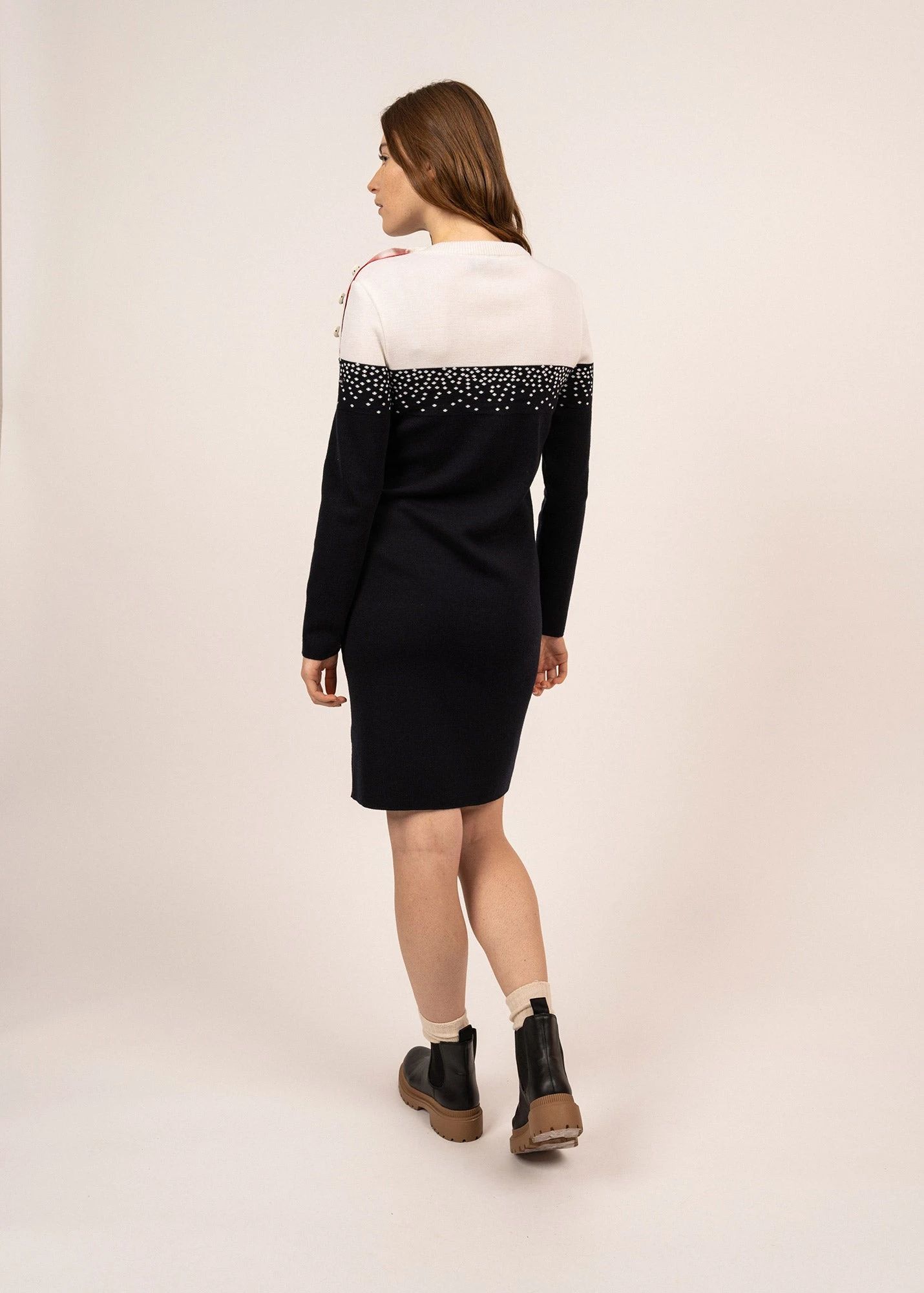 La robe Castillon est idéale pour les fêtes de fin d’année ou un départ aux sports d’hiver avec son joli motif effet “flocons de neige”. On aime ses détails élégants, reprenant les codes de nos pulls marins intemporels. Sous la patte de boutonnage, une bande Tulipe et Rose fluo apporte une touche fantaisie à cette jolie pièce.