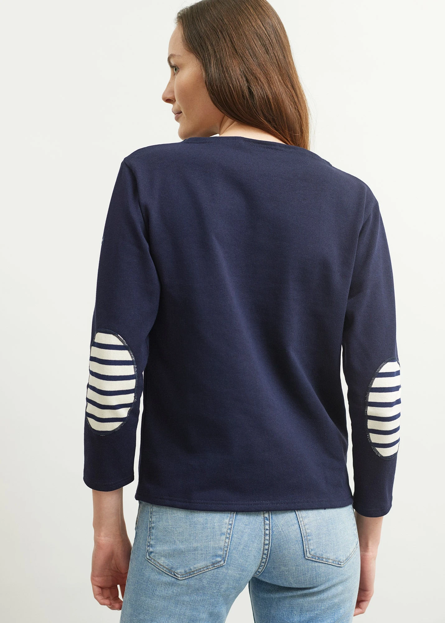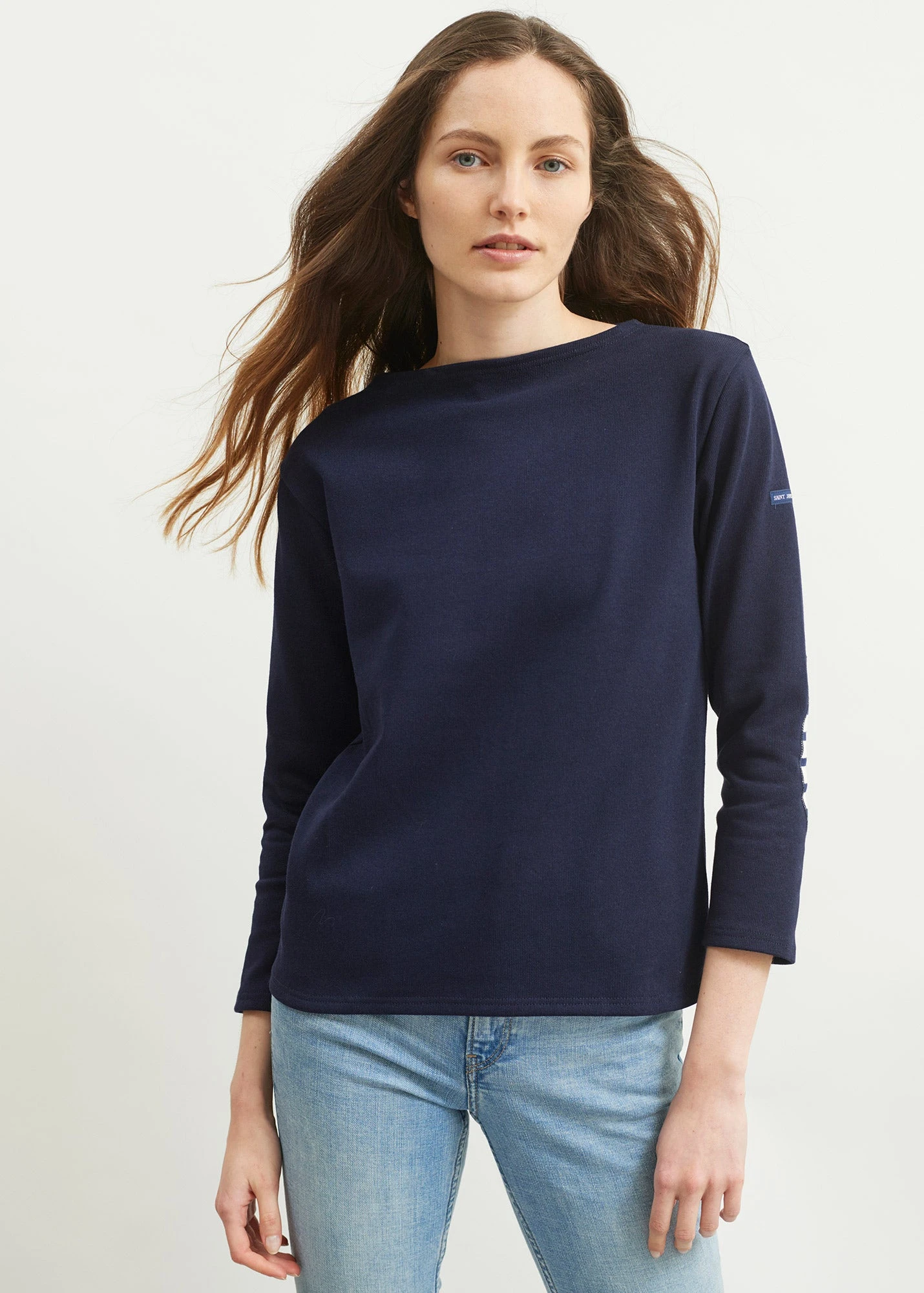 Le T-shirt marin Guildo présente un aspect légèrement rustique du au coton cardé, la forme « carré » du corps reprend l’idée du volume élémentaire de la marinière, l’encolure bateau finalise le vêtement traditionnel. Ce modèle uni se distingue par ses coudières rayées.