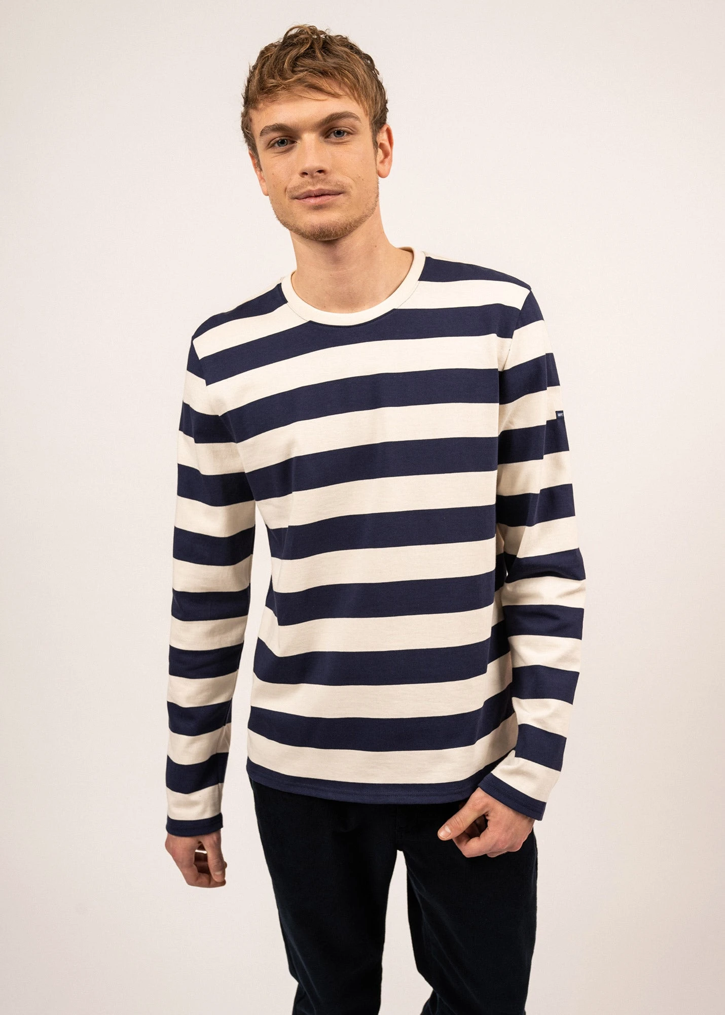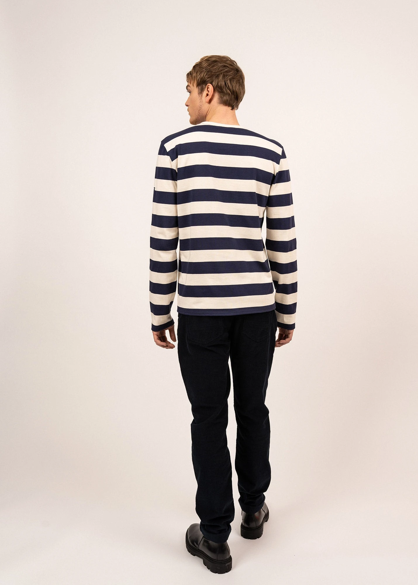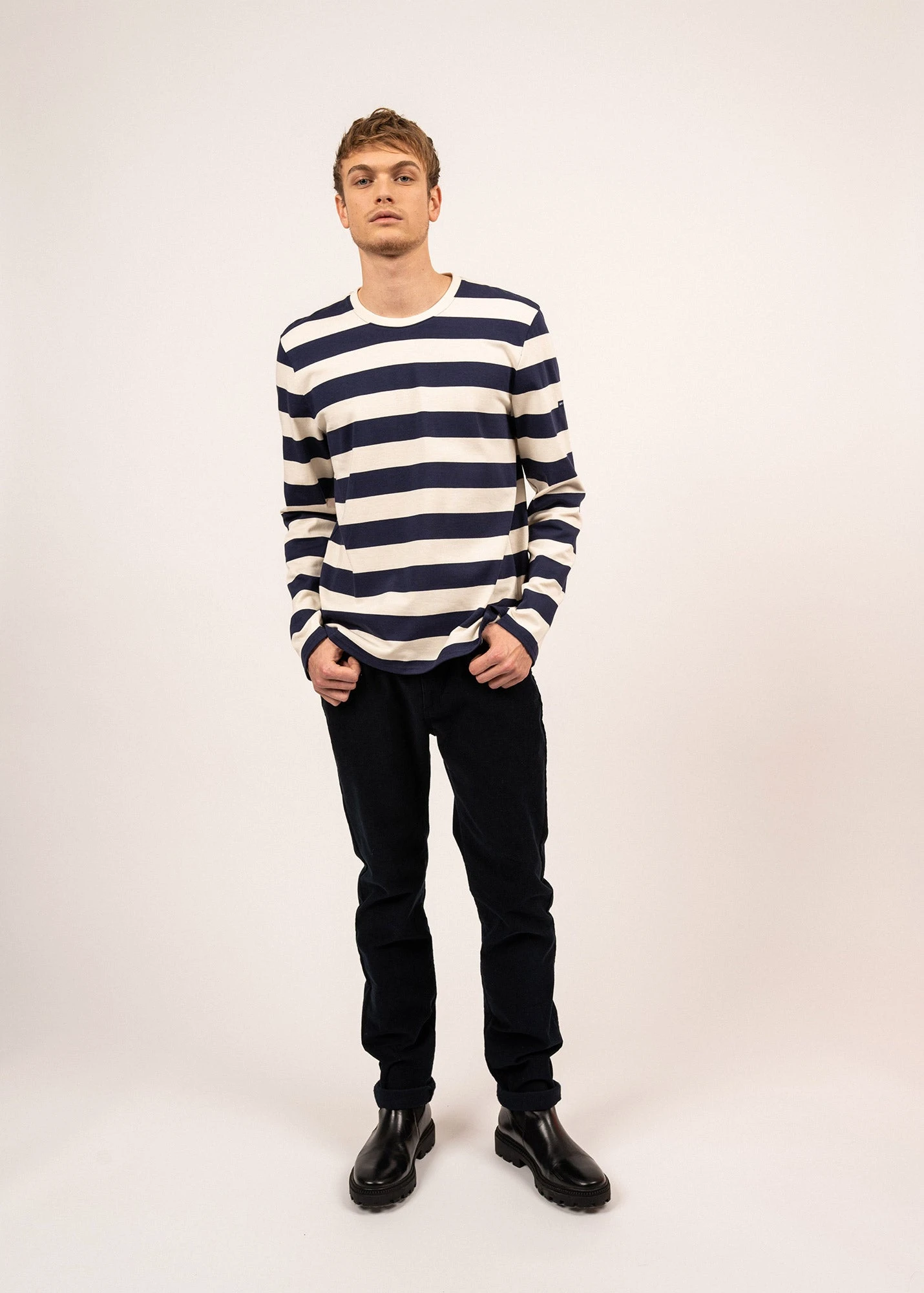 Inspiré de notre ADN marin, le t-shirt en cotn Cherbourg est une déclinaison moderne de nos classiques marinières. Ses rayures larges et son col en bord-côte lui apportent une touche contemporaine et plus urbaine. Confection en jersey de coton, il est doux et léger, agréable à porter.