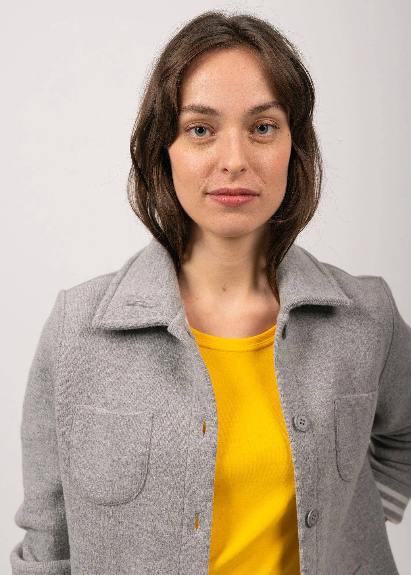 Veste boutonnée en maille double face. Intérieur rayé. Poches plaquées sur la poitrine et en bas. Col chemise avec petite patte fantaisie.